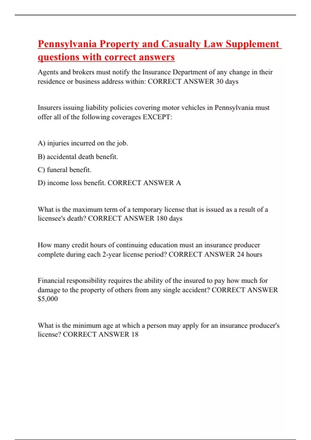 Agents and brokers must notify the Insurance Department of any change in their residence or business address within: CORRECT ANSWER 30 days Insurers issuing liability policies covering motor vehicles in Pennsylvania must offer all of the following coverages EXCEPT: A) injuries incurred on the job. B) accidental death benefit. C) funeral benefit. D) income loss benefit. CORRECT ANSWER A What is the maximum term of a temporary license that is issued as a result of a licensee's death? CORRECT ANSWER 180 days How many credit hours of continuing education must an insurance producer complete during each 2-year license period? CORRECT ANSWER 24 hours Financial responsibility requires the ability of the insured to pay how much for damage to the property of others from any single accident? CORRECT ANSWER $5,000 What is the minimum age at which a person may apply for an insurance producer's license? CORRECT ANSWER 18