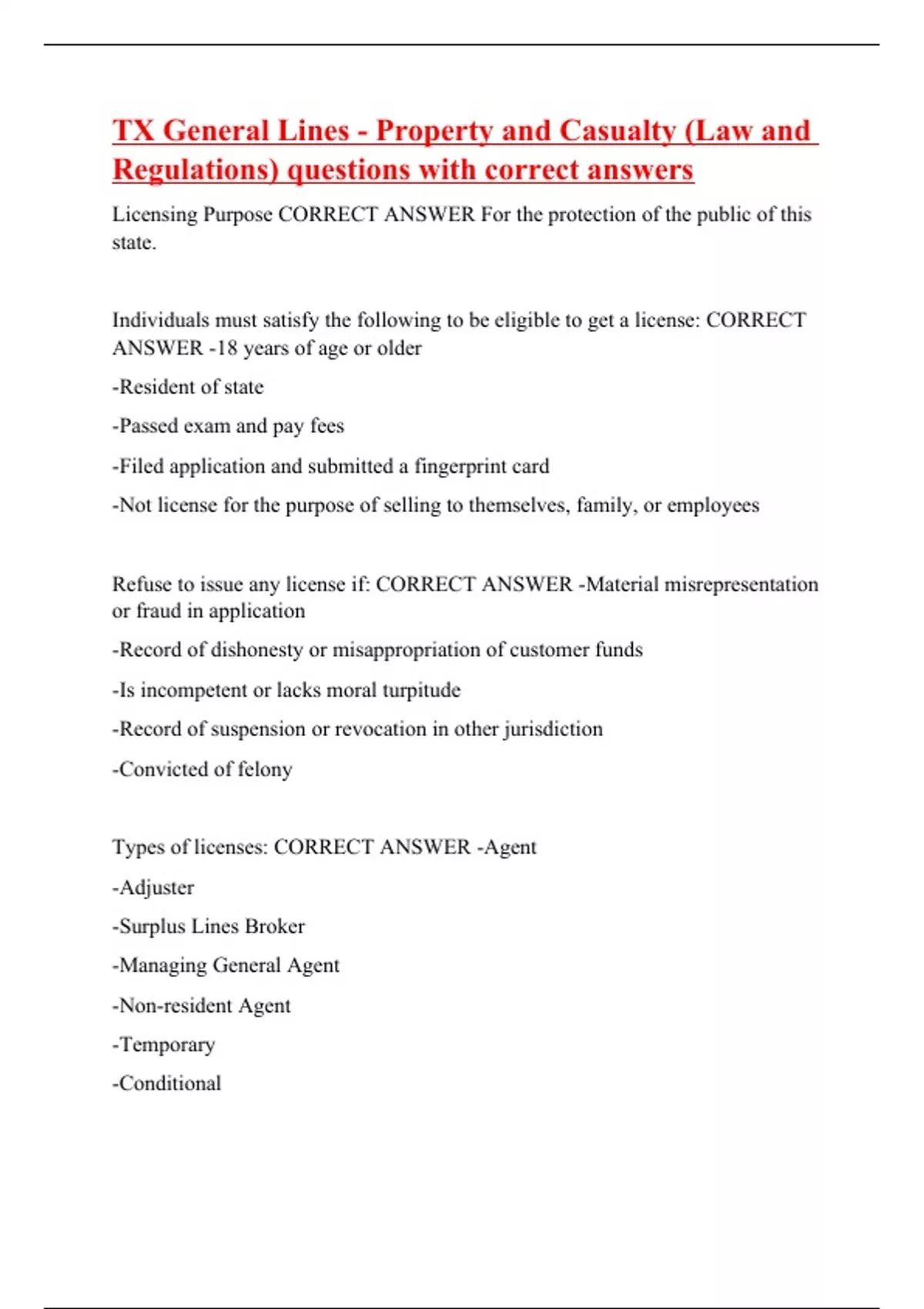 Licensing Purpose CORRECT ANSWER For the protection of the public of this state. Individuals must satisfy the following to be eligible to get a license: CORRECT ANSWER -18 years of age or older -Resident of state -Passed exam and pay fees -Filed application and submitted a fingerprint card -Not license for the purpose of selling to themselves, family, or employees Refuse to issue any license if: CORRECT ANSWER -Material misrepresentation or fraud in application -Record of dishonesty or misappropriation of customer funds -Is incompetent or lacks moral turpitude -Record of suspension or revocation in other jurisdiction -Convicted of felony Types of licenses: CORRECT ANSWER -Agent -Adjuster -Surplus Lines Broker -Managing General Agent