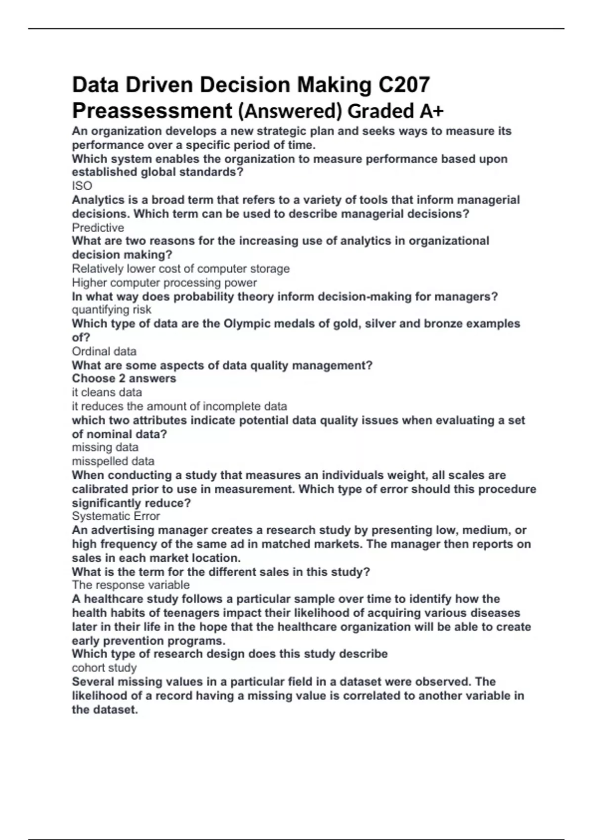Data Driven Decision Making C207 Preassessment (Answered) Graded A+