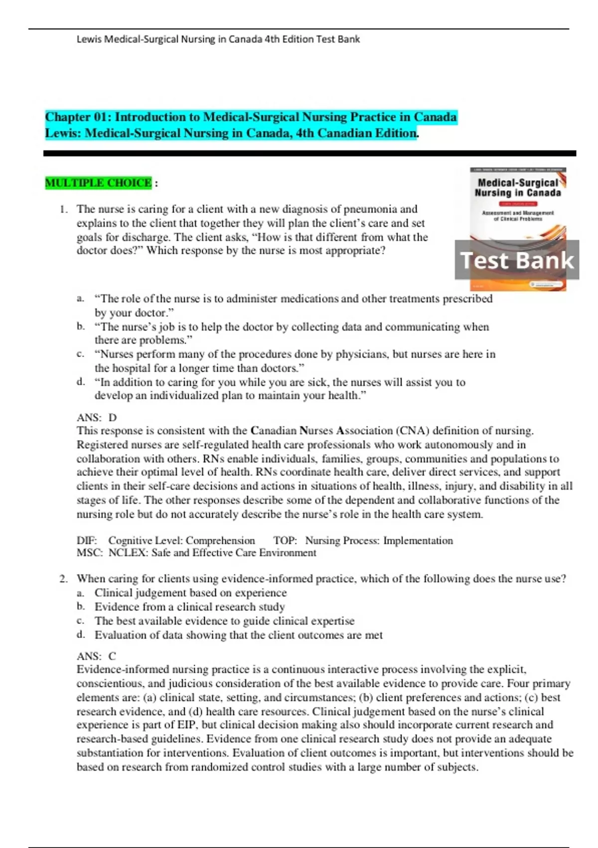 , Lewis Medical-Surgical Nursing in Canada 4th Edition Test Bank