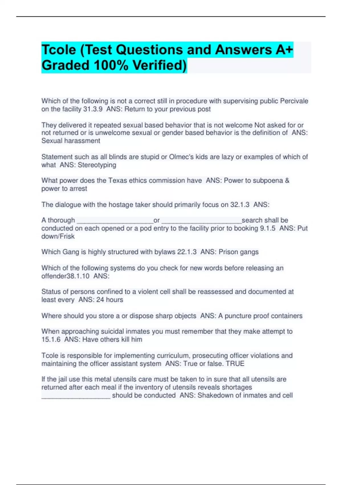 Tcole (Test Questions and Answers A+ Graded 100% Verified) Which of the following is not a correct still in procedure with supervising public Percivale on the facility 31.3.9 ANS: Return to your previous post They delivered it repeated sexual based behavior that is not welcome Not asked for or not returned or is unwelcome sexual or gender based behavior is the definition of ANS: Sexual harassment Statement such as all blinds are stupid or Olmec's kids are lazy or examples of which of what ANS: Stereotyping What power does the Texas ethics commission have ANS: Power to subpoena & power to arrest The dialogue with the hostage taker should primarily focus on 32.1.3 ANS: A thorough ____________________or _____________________search shall be conducted on each opened or a pod entry to the facility prior to booking 9.1.5 ANS: Put down/Frisk Which Gang is highly structured with bylaws 22.1.3 ANS: Prison gangs Which of the following systems do you check for new words before releasing an offender38.1.10 ANS: Status of persons confined to a violent cell shall be reassessed and documented at least every ANS: 24 hours Where should you store a or dispose sharp objects ANS: A puncture proof containers When approaching suicidal inmates you must remember that they make attempt to 15.1.6 ANS: Have others kill him Tcole is responsible for implementing curriculum, prosecuting officer violations and maintaining the officer assistant system ANS: True or false. TRUE If the jail use this metal utensils care must be taken to in sure that all utensils are returned after each meal if the inventory of utensils reveals shortages __________________ should be conducted ANS: Shakedown of inmates and cell Non privilege mail may be withheld, open, and read ANS: True or false. True If an inmate balance is not enough to cover purchases for the commissary you should ANS: Notify the inmate A _____________ is a civil or private wrong or injury for which A court will provide a remedy in the form of an action for damages usually money ANS: Tort The reputation of an officer may be determined by his/her's demeanor and appearance in court ANS: True High risk suicidal inmate should be observed 15.1.7 ANS: Continuously A________________tells something or ask something about the subject of the sentence 36.2.1 ANS: Predicate Each inmate shall be given the opportunity to shower at least ANS: Every other day The type of headcount is conducted after taking a regular account in the numbers does not agree ANS: Off count Texas syndicate members are predominantly made up of 22.1.7 ANS: Mexican males some whites If I lock does not function Easley it should be___________________31.3.4 ANS: Repaired or replaced ____________ is a severe chronic disability of a person five years of age or older 16.1.12 ANS: Developmental disorders Which state agency investigates claims of sexual harassment 5.1.4 ANS: Texas commission on human rights A______________prevents discrimination and stereotyping 4.1.6 ANS: Meritocracy ??? When a person is found hanging one of the procedures is the cut the victim down immediately AND _______________15.1.8 ANS: Avoid cutting the knot If an offender cannot read you should7.2.2 ANS: Read the facility rules to the offender According to TCJS a copy of the facility rules and regulations must be__________________ 7.2.2 ANS: Provided to each inmate or posted for all to view Inmate should be controlled using the ____________of force necessary. 19.1.3 ANS: Least amount How should you approach a suicidal inmate 15.1.6 ANS: Remain calm, have a plan, be alert, Ask direct questions about suicide (all of the above) A person who because of good conduct is given some measure of freedom in and around the jail is a 14.1.10 ANS: Trustee _______________personnel should be summoned anytime a violate cell is entered 21.1.4 ANS: Back up Law-enforcement personnel or one of the most likely groups to seek help for PTSD 16.1.13 ANS: False Chapter 46.05 of the Penal Code is it titled ______________________ 9.1.2 ANS: Prohibited weapons A _______________ is a group of words that express a complete thought 36.2.1 ANS: Sentence Typical behaviors that manifest with mood disorders include all the following except ____________________16.1.5 ANS: Deliberately destroyed others property A.c.t. Stands for______________ 2.1.6 ANS: Alternative ,consequences, tell your story Which of the following are listed as food services dangerous tools? 28.1.8 ANS: Knives,cleavers,mallets, ice picks Which of the following applies/apply only to prison gangs 22.1.3 ANS: Highly