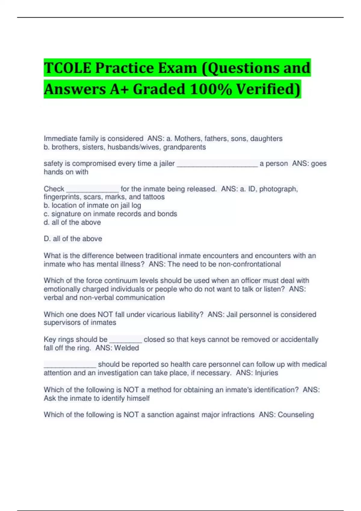 TCOLE Practice Exam (Questions and Answers A+ Graded 100% Verified) Immediate family is considered ANS: a. Mothers, fathers, sons, daughters b. brothers, sisters, husbands/wives, grandparents safety is compromised every time a jailer ____________________ a person ANS: goes hands on with Check _____________ for the inmate being released. ANS: a. ID, photograph, fingerprints, scars, marks, and tattoos b. location of inmate on jail log c. signature on inmate records and bonds d. all of the above D. all of the above What is the difference between traditional inmate encounters and encounters with an inmate who has mental illness? ANS: The need to be non-confrontational Which of the force continuum levels should be used when an officer must deal with emotionally charged individuals or people who do not want to talk or listen? ANS: verbal and non-verbal communication Which one does NOT fall under vicarious liability? ANS: Jail personnel is considered supervisors of inmates Key rings should be ________ closed so that keys cannot be removed or accidentally fall off the ring. ANS: Welded _____________ should be reported so health care personnel can follow up with medical attention and an investigation can take place, if necessary. ANS: Injuries Which of the following is NOT a method for obtaining an inmate's identification? ANS: Ask the inmate to identify himself Which of the following is NOT a sanction against major infractions ANS: Counseling When a defendant has been committed to jail in default of the fine and costs against him or her, this type of wit is issued ___________. ANS: Capias pro fine Inmate transports should be regarded as __________. ANS: Potentially dangerous A cavity search is conducted when ______________. ANS: a. authorized only when "probable cause" exists b. search warrant is obtained except in exigent circumstances c. performed by medical professionals. d. all of the above D. all of the above No medications can help ____________ because it involves permanent intellectual impairment. ANS: Intellectual disabilities Delirium can be traced to one or more contributing factors, including which of the following? ANS: a. infection b. substance withdrawl c. medications d. severe/chronic medical illness e. All of the above E. all of the above What power does the Texas Ethics Commission have ANS: power to subpoena and investigate Which of the following inmate behavior levels would result in the use of weaponless strategies? ANS: compliance The reputation of an officer may be determined by his/her demeanor and appearance in court. ANS: True Inmate work shall be assigned by the ____________. ANS: staff The two types of impressions recorded on a fingerprint card are ______________________. ANS: Rolled and plain Proper administering of medication involves all of the following except ANS: allowing the inmate to save the medication for later Punitive striking of inmates and excessive use of force are examples of ANS: tort liability Reports shall be written in the ___________ in which the event occurred. ANS: order Double negatives commonly involve a _______________. ANS: conjuction An inmate who refuses to comply with any valid commands is considered a/an ________________. ANS: Uncooperative inmate What is a reason/ are reasons for updating inmate records ANS: reclassification, health and release What is the most common form of staphylococcal infection? ANS: Skin infection Compare the bond application to the court document setting bail in the following scenarios except ________________. ANS: communication of sentence. Which of the following are pieces of protective equipment used to prevent transmission of disease in jail environments ANS: Air purification system and duckbill masks After booking who must inmates be allowed to contact upon reasonable request? ANS: attorney Corrections officers are responsible for __________ safety ANS: Inmate and staff When inmates are stressed, they may exhibit which of the following systems? ANS: Tension If unable to confirm criminal street gang membership using a single criteria, two criteria that must be met are identification as a criminal street gang member by reliable informant and __________________ ANS: self- admission outside of a proceeding such as on the internet. Behaviors and/ or symptoms that manifest with mood disorders include all of the following, except _____________. ANS: deliberately destroying others' property Texas Syndicate members are predominantly made up of ___________ ANS: Mexicans males; some whites Public servants are expected to abide by standards of conduct established by ___________________. ANS: Federal government, Texas legislature, and departmental policies According to TCJS 259.154, an additional set of keys shall be maintained by the _________________. ANS: operator All of the following medical needs of the inmate must be recognized and dealt with, except _______________. ANS: compatibility with medical personnel. One of the requirements when distributing commissary items to an inmate is to __________________. ANS: count the items in front of the inmate Which of the following is NOT a typical situation that might result in a hostage taking? ANS: meal time T/F: inmate injuries at the time of booking should be photographed in order to prevent gaps in their medical history. ANS: False T/F: An individual who expresses disparaging remarks or inappropriate jokes directed to an individual who is regarded as inferior is exhibiting the belief that others are strange and different. ANS: False A separate written record of all incidents occurring while administering medication, which results in ______________ should be submitted to the sheriff or operator. ANS: threat/ realized physical harm risk factors used in classification include all of the following, except ANS: sexual orientation Minimun bedding and linens shall include all of the following, except ANS: washcloth Which of the following is NOT a required daily documentation re