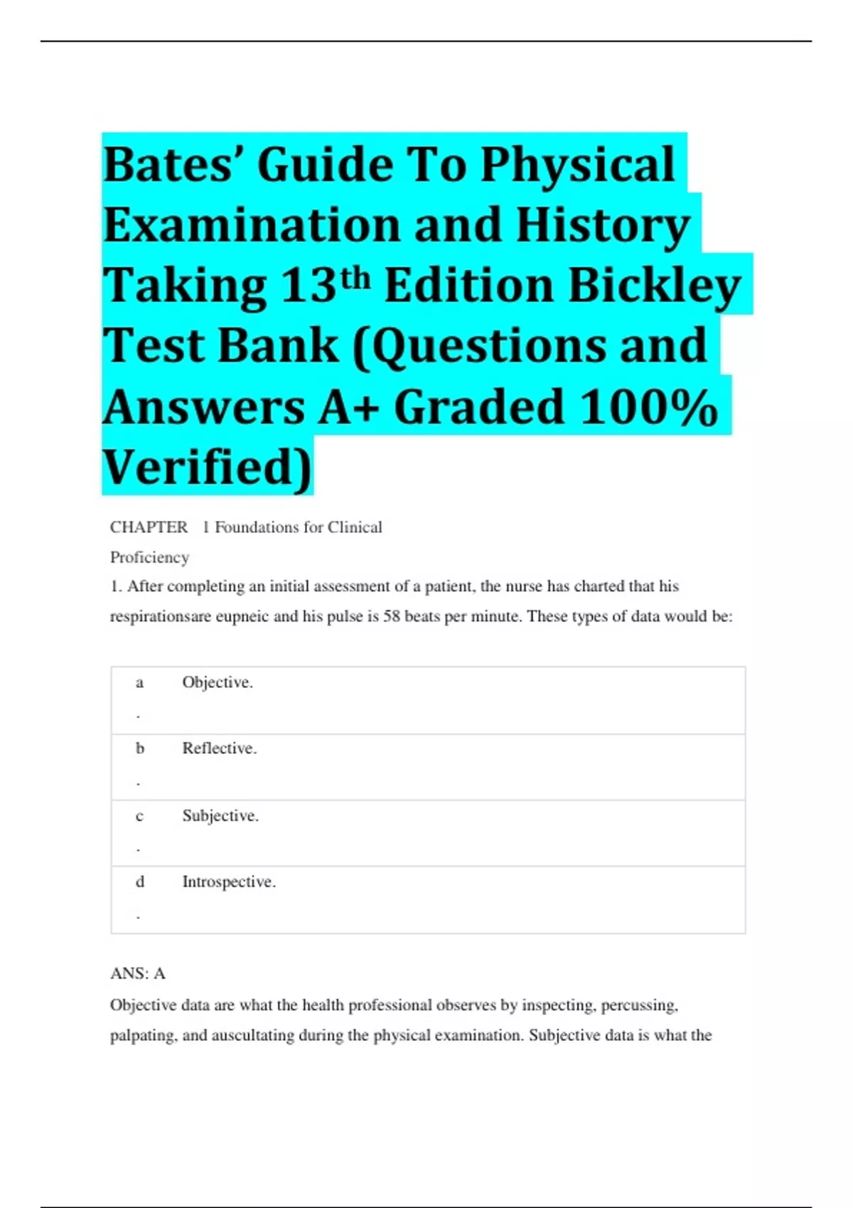 Bates’ Guide To Physical Examination and History Taking 13th Edition Bickley Test Bank (Questions and Answers A+ Graded 100% Verified) CHAPTER 1 Foundations for Clinical Proficiency 1. After completing an initial assessment of a patient, the nurse has charted that his respirations are eupneic and his pulse is 58 beats per minute. These types of data would be: a . Objective. b . Reflective. c . Subjective. d . Introspective. ANS: A Objective data are what the health professional observes by inspecting, percussing, palpating, and auscultating during the physical examination. Subjective data is what the person says about him or herself during history taking. The terms reflective and introspective are not used to describe data. DIF: Cognitive Level: Understanding (Comprehension) REF: p. 2 MSC: Client Needs: Safe and Effective Care Environment: Management of Care 2. A patient tells the nurse that he is very nervous, is nauseated, and feels hot. These types of data would be: a . Objective. b . Reflective. c . Subjective. d . Introspective. ANS: C Subjective data are what the person says about him or herself during history taking. Objective data are what the health professional observes by inspecting, percussing, palpating, and auscultating during the physical examination. The terms reflective and introspective are not used to describe data. DIF: Cognitive Level: Understanding (Comprehension) REF: p. 2 MSC: Client Needs: Safe and Effective Care Environment: Management of Care 3. The patients record, laboratory studies, objective data, and subjective data combine to form the: a . Data base. b . Admitting data. c . Financial statement. d . Discharge summary. ANS: A Together with the patients record and laboratory studies, the objective and subjective data form the data base. The other items are not part of the patients record, laboratory studies, or data. DIF: Cognitive Level: Remembering (Knowledge) REF: p. 2 MSC: Client Needs: Safe and Effective Care Environment: Management of Care 4. When listening to a patients breath sounds, the nurse is unsure of a sound that is heard. The nurses next action should be to: a . Immediately notify the patients physician. b . Document the sound exactly as it was heard. c . Validate the data by asking a coworker to listen to the breath sounds. d . Assess again in 20 minutes to note whether the sound is still present. ANS: C When unsure of a sound heard while listening to a patients breath sounds, the nurse validates the data to ensure accuracy. If the nurse has less experience in an area, then he or she asks an expert to listen. DIF: Cognitive Level: Analyzing (Analysis) REF: p. 2 MSC: Client Needs: Safe and Effective Care Environment: Management of Care 5. The nurse is conducting a class for new graduate nurses. During the teaching session, the nurse should keep in mind that novice nurses, without a background of skills and experience from which to draw, are more likely to make their decisions using: a . Intuition. b . A set of rules. c . Articles in journals. d . Advice from supervisors. ANS: B Novice nurses operate from a set of defined, structured rules. The expert practitioner uses intuitive links. DIF: Cognitive Level: Understanding (Comprehension) REF: p. 3 MSC: Client Needs: General 6. Expert nurses learn to attend to a pattern of assessment data and act without consciously labeling it. These responses are referred to as: a . Intuition. b . The nursing process. c . Clinical knowledge. d . Diagnostic reasoning. ANS: A Intuition is characterized by pattern recognitionexpert nurses learn to attend to a pattern of assessment data and act without consciously labeling it. The other options are not correct. DIF: Cognitive Level: Understanding (Comprehension) REF: p. 4 MSC: Client Needs: General 7. The nurse is reviewing information about evidence-based practice (EBP). Which statement best reflects EBP? a . EBP relies on tradition for support of best practices. b . EBP is simply the use of best practice techniques for the treatment of patients. c . EBP emphasizes the use of best evidence with the clinicians experience. d . The patients own preferences are not important with EBP. ANS: C EBP is a systematic approach to practice that emphasizes the use of best evidence in combination with the clinicians experience, as well as patient preferences and values, when making decisions about care and treatment. EBP is more than simply using the best practice techniques to treat patients, and questioning tradition is important when no compelling and supportive research evidence exists. DIF: Cognitive Level: Applying (Application) REF: p. 5 MSC: Client Needs: Safe and Effective Care Environment: Management of Care 8. The nurse is conducting a class on priority setting for a group of new graduate nurses. Which is an example of a first-level priority problem? a . Patient with postoperative pain b . Newly diagnosed patient with diabetes who needs diabetic teaching c . Individual with a small laceration on the sole of the foot d . Individual with shortness of breath and respiratory distress ANS: D First-level priority problems are those that are emergent, life threatening, and immediate (e.g., establishing an airway, supporting breathing, maintaining circulation, monitoring abnormal vital signs) (see Table 1-1). DIF: Cognitive Level: Understanding (Comprehension) REF: p. 4 MSC: Client Needs: Safe and Effective Care Environment: Management of Care 9. When considering priority setting of problems, the nurse keeps in mind that second-level priority problems include which of these aspects? a . Low self-esteem