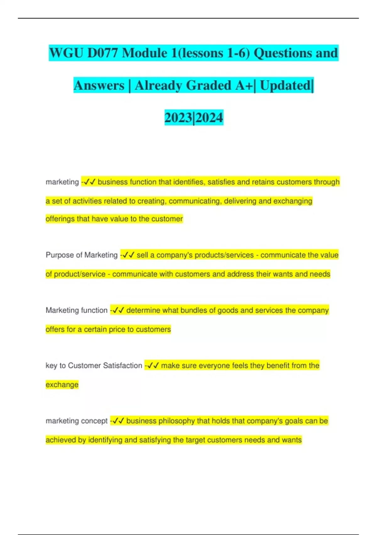 WGU D077 Module 1(lessons 1-6) Questions and Answers | Already Graded A+| Updated| 2023|2024 marketing - business function that identifies, satisfies and retains customers through a set of activities related to creating, communicating, delivering and exchanging offerings that have value to the customer Purpose of Marketing - sell a company's products/services - communicate the value of product/service - communicate with customers and address their wants and needs Marketing function - determine what bundles of goods and services the company offers for a certain price to customers key to Customer Satisfaction - make sure everyone feels they benefit from the exchange marketing concept - business philosophy that holds that company's goals can be achieved by identifying and satisfying the target customers needs and wants marketing concept involves - focusing on needs/wants of customers, integrating all organizations activities to satisfy these needs and wants, achieve long-term goals by satisfying customer wants and needs legally and responsibly marketing mix - represents the controllable elements in the marketing environment (product, price, promotion and place) Product lIfe cycle - introduction, growth, maturity, decline product mix - complete range of products for sale by company product width - number of different product lines a company offers product lines - series of related products offered by one company product depth - number of versions offered for each product in the product line Promotion - ways in which a product is advertises (traditional advertising, sales promotion, public relations, personal selling, social media and digital marketing) Price - something given in exchange for a product - determines company's profit Pricing strategy - based on demand for the product and the cost of producing the product Price skimming - intentionally pricing a new product high with the intention of lowering overtime as competition grows Price skimming advantages - find out what buyers willing to pay, price can be lowered, create an image of quality and prestige, when price lowered seen as bargain penetration pricing - intentionally pricing a product lower than market price to gain market share Penetration Pricing advantages - low initial price may induce consumers to switch brands, discourage competitors from entering the market Leader pricing (Loss leader) - pricing products below the normal markup or below cost to attract customers to a store where they would not otherwise shop bundling - grouping 2 or more related products together and pricing them as a single products Prestige pricing - raising the price of a product so consumers will perceive it as being of higher quality, statue or value
