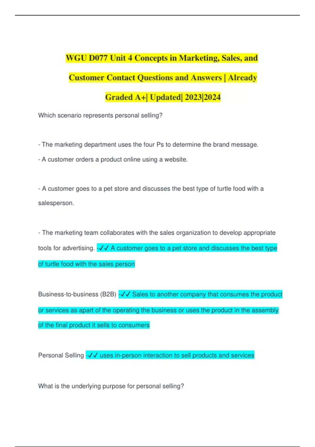 WGU D077 Unit 4 Concepts in Marketing, Sales, and Customer Contact Questions and Answers | Already Graded A+| Updated| 2023|2024 Which scenario represents personal selling? - The marketing department uses the four Ps to determine the brand message. - A customer orders a product online using a website. - A customer goes to a pet store and discusses the best type of turtle food with a salesperson. - The marketing team collaborates with the sales organization to develop appropriate tools for advertising. - A customer goes to a pet store and discusses the best type of turtle food with the sales person Business-to-business (B2B) - Sales to another company that consumes the product or services as apart of the operating the business or uses the product in the assembly of the final product it sells to consumers Personal Selling - uses in-person interaction to sell products and services What is the underlying purpose for personal selling? - To assist marketing in determining the correct product and price - To obtain customer feedback to improve the product - To provide interaction between the buyer and the seller - To identify good prospects - To provide interaction between the buyer and the seller What is at the core of personal selling? - Provide quality information to potential buyers - The human exchange between buyer and seller - Avoid unethical behavior - Identify the right marketing mix of product and price - The human exchange between buyer and seller What is effective personal selling? - Identifying good prospects that are predisposed and well-suited to the product or service being offered - Building mutual trust and respect between buyer and seller where benefit comes to both parties - Giving honest responses to any questions the buyer has and showing that the salesperson cares - Addressing customers' needs and preferences without making them feel pressured - Addressing customers' needs and preferences without making the