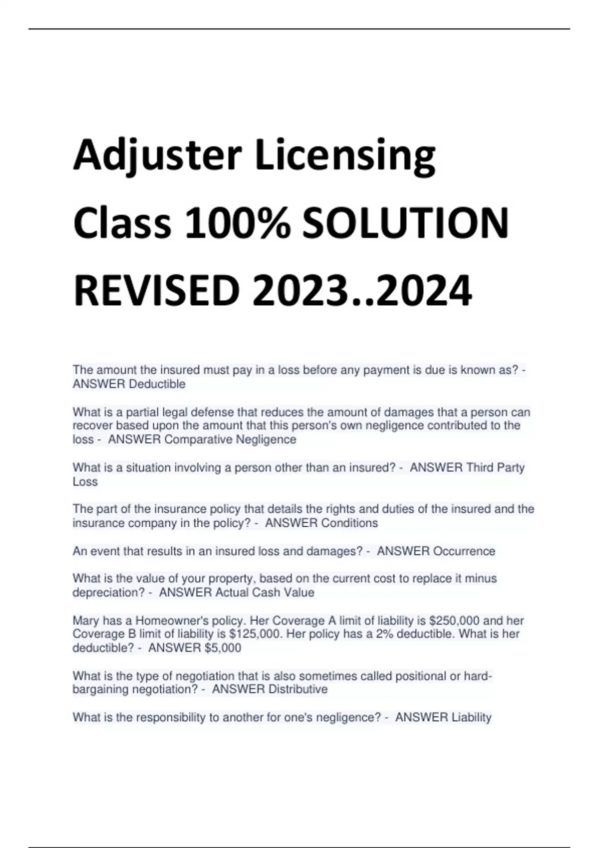 Adjuster Licensing Class 100% SOLUTION REVISED 2023..2024