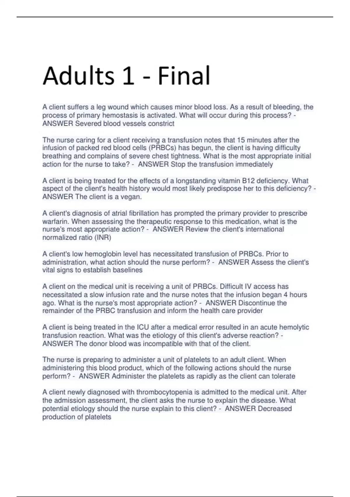 A client comes to the clinic reporting fatigue and the health interview is suggestive of pica. Laboratory findings reveal a low serum iron level and a low ferritin level. With what would the nurse suspect that the client will be diagnosed? - ANSWER Iron deficiency anemia A client is admitted to the hospital with pernicious anemia. The nurse should prepare to administer which of the following medications? - ANSWER Vitamin B12