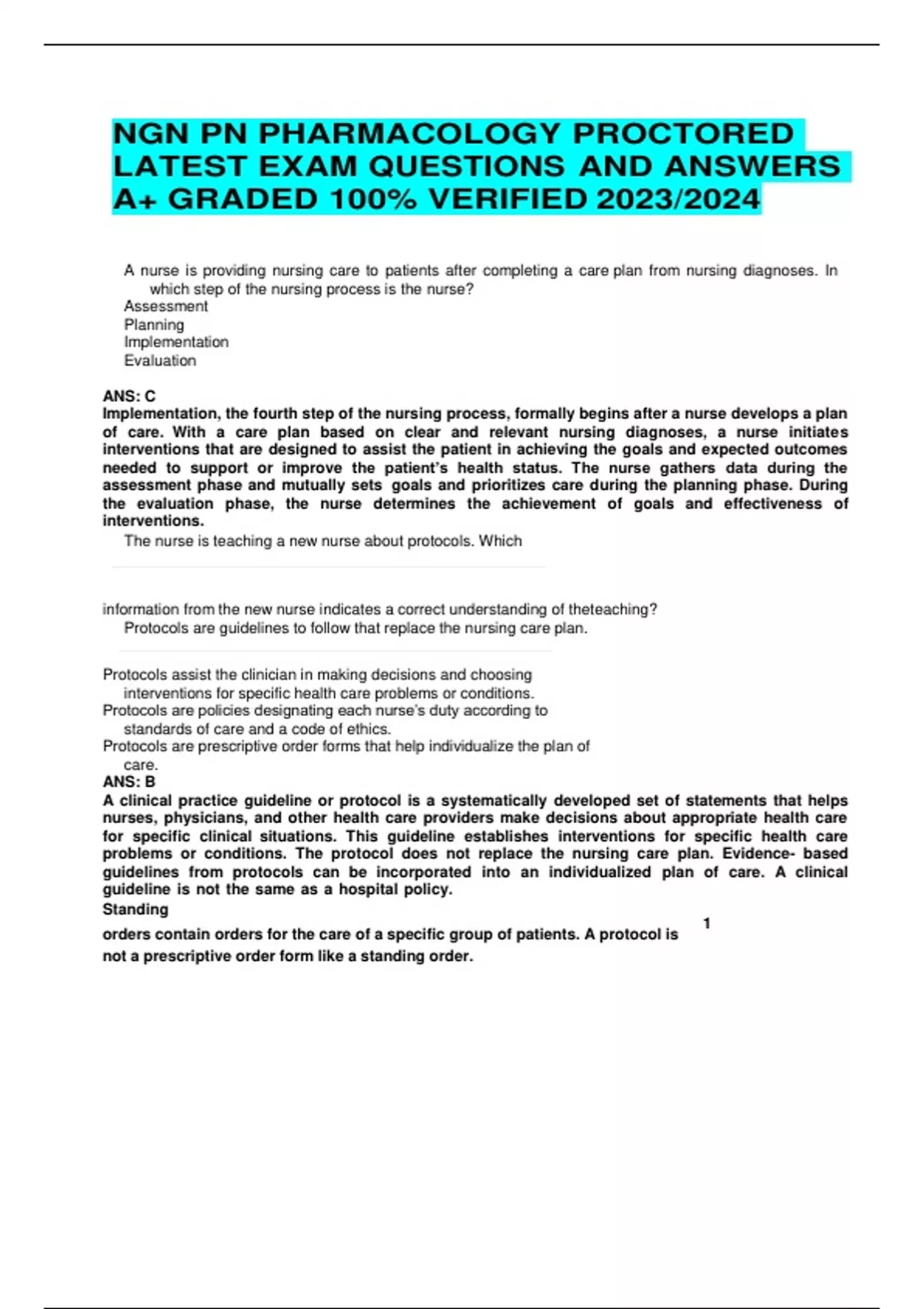 NGN PN PHARMACOLOGY PROCTORED LATEST EXAM QUESTIONS AND ANSWERS A+ GRADED 100% VERIFIED 2023/2024 A nurse is providing nursing care to patients after completing a care plan from nursing diagnoses. In which step of the nursing process is the nurse? Assessment Planning Implementation Evaluation ANS: C Implementation, the fourth step of the nursing process, formally begins after a nurse develops a plan of care. With a care plan based on clear and relevant nursing diagnoses, a nurse initiates interventions that are designed to assist the patient in achieving the goals and expected outcomes needed to support or improve the patient’s health status. The nurse gathers data during the assessment phase and mutually sets goals and prioritizes care during the planning phase. During the evaluation phase, the nurse determines the achievement of goals and effectiveness of interventions. The nurse is teaching a new nurse about protocols. Which information from the new nurse indicates a correct understanding of theteaching? Protocols are guidelines to follow that replace the nursing care plan. Protocols assist the clinician in making decisions and choosing interventions for specific health care problems or conditions. Protocols are policies designating each nurse’s duty according to standards of care and a code of ethics. Protocols are prescriptive order forms that help individualize the plan of care. ANS: B A clinical practice guideline or protocol is a systematically developed set of statements that helps nurses, physicians, and other health care providers make decisions about appropriate health care for specific clinical situations. This guideline establishes interventions for specific health care problems or conditions. The protocol does not replace the nursing care plan. Evidence- based guidelines from protocols can be incorporated into an individualized plan of care. A clinical guideline is not the same as a hospital policy. Standing orders contain orders for the care of a specific group of patients. A protocol is 1 not a prescriptive order form like a standing order. The standing orders for a patient include acetaminophen 650 mg every 4 hours prn for headache. After assessing the patient, the nurse identifies the need for headache relief and determines that the patient has not had acetaminophen in the past 4 hours. Which action will the nurse take next? Administer the acetaminophen. Notify the health care provider to obtain a verbal order. Direct the nursing assistive personnel to give the acetaminophen. Perform a pain assessment only after administeringthe acetaminophen. ANS: A A standing order is a preprinted document containing orders for the conduct of routine therapies, monitoring guidelines, and/or diagnostic procedures for specific patients with identified clinical problems. The nurse will administer the medication. Notifying the health care provider is not necessary if a standing order exists. The nursing assistive personnel are not licensed to administer medications; therefore, medication administration should not be delegated to this person. A pain assessment should be performed before andafter pain medication administration to assess the need for and effectivenessof the medication. Which action indicates a nurse is using critical thinking forimplementation of nursing care to patients? Determines whether an intervention is correct and appropriate for the a. given situation Rea d s over the steps and performs a procedure despite lack of clinicalcompetency b . c. Establishes goals for a particular patient without assessment d. Evaluates the effectiveness of interventions ANS: A As you implement interventions, use critical thinking to confirm whether the interventions are correct and still appropriate for a patient’s clinical situation. You are responsible for having the necessary knowledge and clinical competency to perform interventions for your patients safely and effectively. The nurse needs to recognize the safety hazards of performing an intervention without clinical competency and seek assistance from another nurse. The nurse cannot evaluate interventions until they are implemented. Patients need 2 ongoing assessment before establishing goals because patient conditions can change rapidly. A nurse is reviewing a patient’s care plan. Which information will the nurse identify as a nursing intervention? The patient will ambulate in the hallway twice this shift using crutches correctly. Impaired physical mobility related to inability to bear weight on right leg. Provide assistance while the patient walks in the hallway twice this shift with crutches. The patient is unable to bear weight on right lower extremity. ANS: C Providing assistance to a patient who is ambulating is a nursing intervention. The statement, “The patient will ambulate in the hallway twice this shift using crutches correctly” is a patient outcome. Impaired physical mobilityis a nursing diagnosis. The statement that the patient is unable to bear weight and ambulate can be included with assessment data and is a defining characteristic for the diagnosis of Impaired physical mobility. A patient recovering from a leg fracture after a fall reports having dull pain in the affected leg and rates it as a 7 on a 0 to 10 scale. The patient is not able to walk around in the room with crutches because of leg discomfort. Which nursing intervention is priority? Assist the patient to walk in the room with crutches. Obtain a walker for the patient. Consult physical therapy. Administer pain medication. ANS: D The patient’s pain is a 7, indicating the priority is pain relief (administer pain medication). Acute pain is the priority because the nurse can address the problem of immobility after the patient receives adequate pain relief. Assisting the patient to walk or obtaining a walker will not address the pain the patient is experiencing. The nurse is caring for a patient who requires a complex dressing change. While in the 