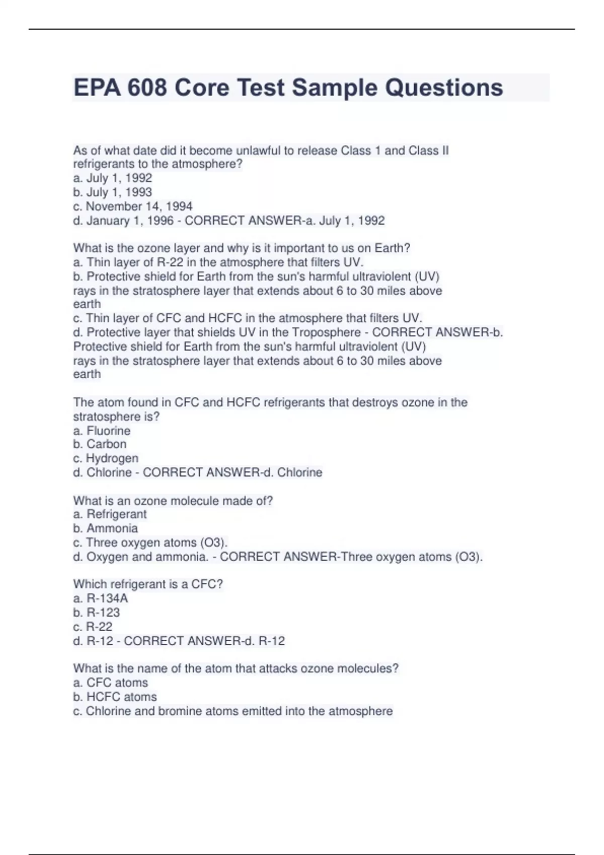 EPA 608 Core Test Sample Questions As of what date did it become unlawful to release Class 1 and Class II refrigerants to the atmosphere? a. July 1, 1992 b. July 1, 1993 c. November 14, 1994 d. January 1, 1996 - CORRECT ANSWER-a. July 1, 1992 What is the ozone layer and why is it important to us on Earth? a. Thin layer of R-22 in the atmosphere that filters UV. b. Protective shield for Earth from the sun's harmful ultraviolent (UV) rays in the stratosphere layer that extends about 6 to 30 miles above earth c. Thin layer of CFC and HCFC in the atmosphere that filters UV. d. Protective layer that shields UV in the Troposphere - CORRECT ANSWER-b. Protective shield for Earth from the sun's harmful ultraviolent (UV) rays in the stratosphere layer that extends about 6 to 30 miles above earth The atom found in CFC and HCFC refrigerants that destroys ozone in the stratosphere is? a. Fluorine b. Carbon c. Hydrogen d. Chlorine - CORRECT ANSWER-d. Chlorine What is an ozone molecule made of? a. Refrigerant b. Ammonia c. Three oxygen atoms (O3). d. Oxygen and ammonia. - CORRECT ANSWER-Three oxygen atoms (O3). Which refrigerant is a CFC? a. R-134A b. R-123 c. R-22 d. R-12 - CORRECT ANSWER-d. R-12 What is the name of the atom that attacks ozone molecules? a. CFC atoms b. HCFC atoms c. Chlorine and bromine atoms emitted into the atmosphere d. a and b - CORRECT ANSWER-c. Chlorine and bromine atoms emitted into the atmosphere Which refrigerant is a HFC? a. R-134A b. R-123 c. R-22 d. R-12 - CORRECT ANSWER-a. R-134A Describe how one Chlorine atom can destroy 100,000 ozone molecules. a. Chlorine releases one of the oxygen atoms and forms two O2 oxygen molecules, leaving the chlorine molecule free to attack another ozone molecule and repeat the process. b. Chlorine locks up the ozone molecule and then and then goes after another. c. Chlorine converts the ozone to bromine and then attacks more ozone molecules. d. Chlorine can bleach 100,000 ozone molecules before it weakens. - CORRECT ANSWER-a. Chlorine releases one of the oxygen atoms and forms two O2 oxygen molecules, leaving the chlorine molecule free to attack another ozone molecule and repeat the process. Which refrigerant contains no chlorine? a. R-134A b. R-123 c. R-22 d. R-12 - CORRECT ANSWER-a. R-134A Name the refrigerant types that belong to CFCs, HCFCs and HFCs a. CFC R-11, R-12, R-500 b. HCFC R-22, R-123 c. HFC R-134a d. All of the above are correct - CORRECT ANSWER-d. All of the above are correct The rule of thumb for refilling approved cylinders is a maximum of ___ percent liquid? a. 60% b. 79% c. 80% d. 90% - CORRECT ANSWER-c. 80% What do the letters in "HCFC" stand for? a. High Carbon Fluorine Chlorine b. hydrochlorofluorocarbons c. Harmful Carbon Fluorine Chlorine d. highchlorinefluorocarbon - CORRECT ANSWER-b. hydrochlorofluorocarbons To recover refrigerant is to? a. Remove a refrigerant in any condition from a system in either an active or passive manner, and store it in an external container without necessarily testing or processing b. Reduce contaminants in used refrigerant by oil separation through filter dryers. c. Reprocess refrigerant to new product specifications d. Remove refrigerant and change ownership. - CORRECT ANSWER-a. Remove a refrigerant in any condition from a system in either an active or passive manner, and store it in an external container without necessarily testing or processing What is ODP? a. Oxygen Destruction Properties b. Ozone Depletion Potential c. Ozone Destruction Properties d. Oxygen Depletion Potential - CORRECT ANSWER-b. Ozone Depletion Potential R-134A is a "drop in" refrigerant for? 36 | P a g e a. R-12 b. R-22 c. R-11 d. R-134A is not a drop-in refrigerant - CORRECT ANSWER-d. R-134A is not a drop-in refrigerant Name some of the health and environmental effects of ozone depletion. a. Increased Temperature of the Earth b. Increased Cases of Skin Cancer c. Increased numbers of Cataracts in the eyes d. All the above - CORRECT ANSWER-d. All the above The condition and state of the refrigerant leaving a receiver is? a. Subcooled liquid b. Subcooled vapor c. Superheated vapor d. Superheated liquid. - CORRECT ANSWER-a. Subcooled liquid What evidence do we have that CFCs and HCFCs are depleting the ozone? a. The rise in the amount of chlorine measured in the stratosphere over the past two decades matches the rise in the amount of fluorine. b. The rise in the amount of chlorine measured in the stratosphere over the past two decades matches the rise in CFC emissions over the same period. c. Samples of air taken from the stratosphere over erupting volcanoes show that volcanoes contribute a small quantity of chlorine to the stratosphere compared to CFCs. d. All the above - CORRECT ANSWER-d. All the above The component of an air conditioning system that changes a low pressure vapor to a high pressure vapor is the? a. Condenser b. Metering device c. Evaporator d. Compressor 20.What characteristics - CORRECT ANSWER-d. Compressor What characteristics make it easy for CFCs to reach the stratosphere and how do they get there? a. CFCs are lighter than air atoms and rise into the Stratosphere. b. CFCs will not dissolve in water or break down into compounds that dissolve in water. Wind moves them into the Stratosphere c. Heating of the CFCs makes them lighter than air. d. a and c - CORRECT ANSWER-b. CFCs will not dissolve in water or break down into compounds that dissolve in water. Wind moves them into the Stratosphere Why do we now use R-134a refrigerant? a. It costs less b. HFCs do not contain any chlorine c. It is a drop in replacement for R-22 d. It is a drop in replacement for R-11 - CORRECT ANSWER-b. HFCs do not contain any chlorine What is the purpose of the CAA? 37 | P a g e a. Regulate California Air quality b. Clean the air in the US c. Limit how much of a pollutant can be in the air in the US - CORRECT ANSWER-c. Limit how much of a pollutant can be in the air in the US What three things is the CAA doing to control 