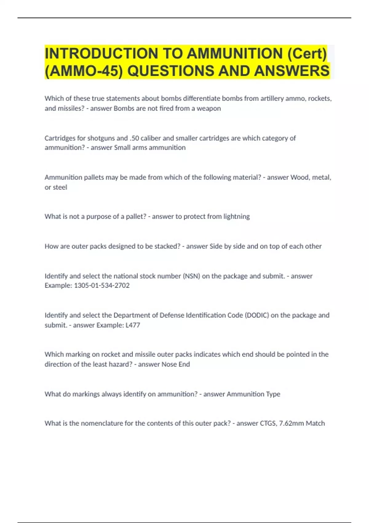 INTRODUCTION TO AMMUNITION (Cert) (AMMO-45) QUESTIONS AND ANSWERS.