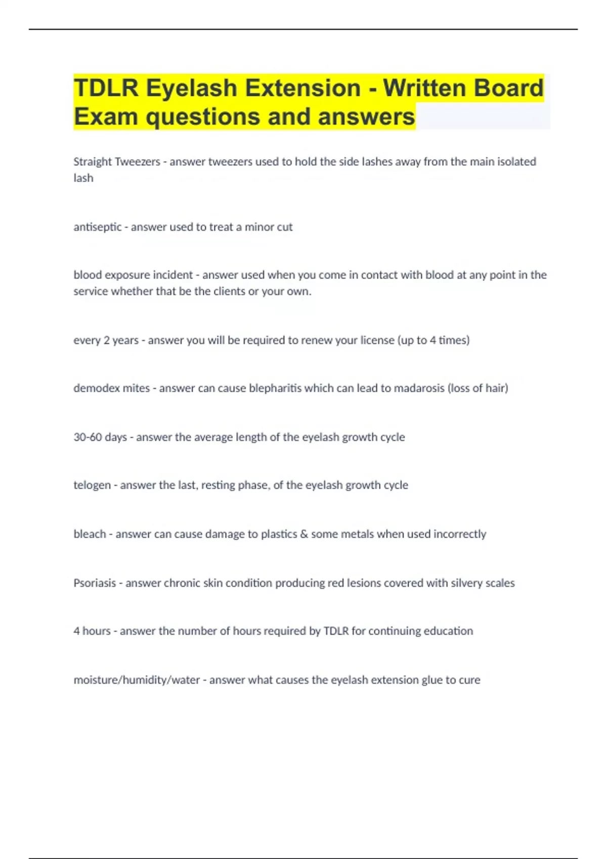 TDLR Eyelash Extension - Written Board Exam questions and answers