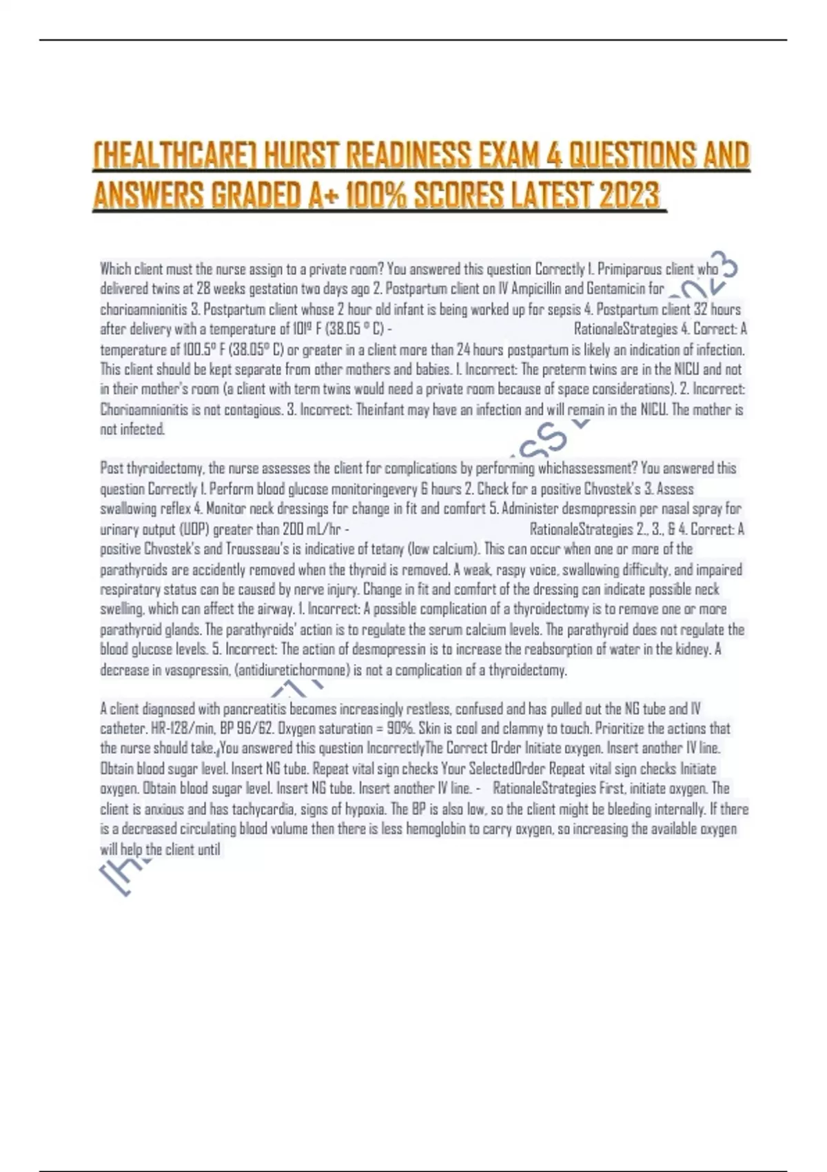 [HEALTHCARE] HURST READINESS EXAM 4 QUESTIONS AND ANSWERS GRADED A+ 100% SCORES LATEST 2023 Which client must the nurse assign to a private room? You answered this question Correctly 1. Primiparous client who delivered twins at 28 weeks gestation two days ago 2. Postpartum client on IV Ampicillin and Gentamicin for chorioamnionitis 3. Postpartum client whose 2 hour old infant is being worked up for sepsis 4. Postpartum client 32 hours after delivery with a temperature of 101º F (38.05 ° C) - RationaleStrategies 4. Correct: A temperature of 100.5° F (38.05° C) or greater in a client more than 24 hours postpartum is likely an indication of infection. This client should be kept separate from other mothers and babies. 1. Incorrect: The preterm twins are in the NICU and not in their mother's room (a client with term twins would need a private room because of space considerations). 2. Incorrect: Chorioamnionitis is not contagious. 3. Incorrect: The infant may have an infection and will remain in the NICU. The mother is not infected. Post thyroidectomy, the nurse assesses the client for complications by performing which assessment? You answered this question Correctly 1. Perform blood glucose monitoring every 6 hours 2. Check for a positive Chvostek's 3. Assess swallowing reflex 4. Monitor neck dressings for change in fit and comfort 5. Administer desmopressin per nasal spray for urinary output (UOP) greater than 200 mL/hr - RationaleStrategies 2., 3., & 4. Correct: A positive Chvostek's and Trousseau's is indicative of tetany (low calcium). This can occur when one or more of the parathyroids are accidently removed when the thyroid is removed. A weak, raspy voice, swallowing difficulty, and impaired respiratory status can be caused by nerve injury. Change in fit and comfort of the dressing can indicate possible neck swelling, which can affect the airway. 1. Incorrect: A possible complication of a thyroidectomy is to remove one or more parathyroid glands. The parathyroids' action is to regulate the serum calcium levels. The parathyroid does not regulate the blood glucose levels. 5. Incorrect: The action of desmopressin is to increase the reabsorption of water in the kidney. A decrease in vasopressin, (antidiuretic hormone) is not a complication of a thyroidectomy. A client diagnosed with pancreatitis becomes increasingly restless, confused and has pulled out the NG tube and IV catheter. HR-128/min, BP 96/62. Oxygen saturation = 90%. Skin is cool and clammy to touch. Prioritize the actions that the nurse should take. You answered this question IncorrectlyThe Correct Order Initiate oxygen. Insert another IV line. Obtain blood sugar level. Insert NG tube. Repeat vital sign checks Your Selected Order Repeat vital sign checks Initiate oxygen. Obtain blood sugar level. Insert NG tube. Insert another IV line. - RationaleStrategies First, initiate oxygen. The client is anxious and has tachycardia, signs of hypoxia. The BP is also low, so the client might be bleeding internally. If there is a decreased circulating blood volume then there is less hemoglobin to carry oxygen, so increasing the available oxygen will help the client until the problem is corrected. Second, get the IV started so fluid resuscitation can continue.This increased volume will improve the blood pressure. More volume, more pressure. The IV will also provide a port for needed medications. Third, check the client's blood sugar. Since the pancreas is sick, insulin production can be decreased so glucose can go up. This is next in the priority line of the available options. You have addressed air and circulation, so blood glucose would be next. Fourth, insert the NG tube so that the client can be kept empty and dry and you can prevent aspiration if the client starts vomiting. Last, recheck vital signs to assess effectiveness of your nursing actions. What is the best instruction the nurse should provide when administering acetylsalicylic acid 81 mg to a client experiencing severe, crushing chest pain radiating up the left jaw? You answered this question Correctly 1. Chew the acetylsalicylic acid prior to swallowing. 2. Place the acetylsalicylic acid under the tongue so that it can dissolve. 3. Swallow the acetylsalicylic acid tablet. 4. Insert the acetylsalicylic acid between the cheek and gum for greater absorption. - RationaleStrategies 1. Correct: Acetylsalicylic acid has been shown to decrease mortality and re-infarction rates after MI. The fastest way to get the aspirin into the circulatory system is to have the client chew the acetylsalicylic acid prior to swallowing. 2. Incorrect: Nitroglycerin is administered sublingual (SL) or buccal. Initially acetylsalicylic acid is administered by chewing the tablet or swallowing the tablet. 3. Incorrect: If a solid dose pill is prescribed, the pill should be chewed. Faster absorption is obtained from chewing, rather than swallowing acetylsalicylic acid. 4. Incorrect: Nitroglycerin is administered SL or buccal. Initially acetylsalicylic acid would be chewed to increase the absorption rate. A client who has developed hypovolemic shock is receiving albumin. What assessment finding by the nurse indicates that the albumin has been effective? You answered this question Correctly 1. Swelling in the legs 2. Increase in uninary output 3. Proteinuria 4. Increase in waist measurement - RationaleStrategies 2. Correct: The action of albumin is to increase the serum albumin level. When the albumin level increases there is a shift of fluid from extracellular to intracellular. This action will result in an increase in urinary output. 1. Incorrect: This is a symptom of hypoalbuminemia. There is a shift in the fluid from intracellular to extracellular. This results in the swelling of the legs. 3. Incorrect: Hypoalbuminemia may cause damage to the kidneys. Proteinuria is indicative of renal disease or damage. 4. Incorrect: There may be a increased accumulation of fluid in the abdomen. The ascites is due to th