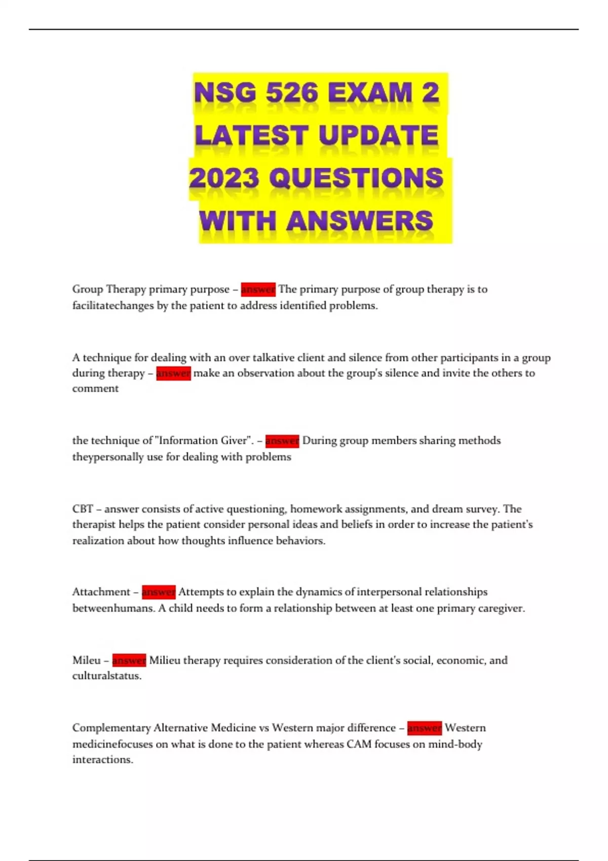 NSG 526 EXAM 2 LATEST UPDATE 2023 QUESTIONS WITH ANSWERS [NEWEST UPDATE] Group Therapy primary purpose – answer The primary purpose of group therapy is to facilitate changes by the patient to address identified problems. A technique for dealing with an over talkative client and silence from other participants in a group during therapy – answer make an observation about the group's silence and invite the others to comment the technique of "Information Giver". – answer During group members sharing methods they personally use for dealing with problems CBT – answer consists of active questioning, homework assignments, and dream survey. The therapist helps the patient consider personal ideas and beliefs in order to increase the patient's realization about how thoughts influence behaviors. Attachment – answer Attempts to explain the dynamics of interpersonal relationships between humans. A child needs to form a relationship between at least one primary caregiver. Mileu – answer Milieu therapy requires consideration of the client's social, economic, and cultural status. Complementary Alternative Medicine vs Western major difference – answer Western medicine focuses on what is done to the patient whereas CAM focuses on mind-body interactions. Beck – answer Beck developed the cognitive model of depression and the concept that cognitive processing distortions underlie psychological disorders ACTIVE, TIME-LIMITED APPROACH depression can be understood via schemas: - answer Beck; cognitive errors, and the cognitive triad (i.e., negative views of self, tendency toward interpreting experiences in a negative manner, and holding negative views of the future). Beck assumption – answer Distorted thinking contributes to and maintains bheavior (symptoms) Ellis – answer RET (Rational Emotive Therapy) a form of cbt ret – answer unrealistic and irrational beliefs cause many emotional problems. The purpose of RET is to identify an irrational belief and dispute it through active, philosophical, confrontational therapy. RET assumption – answer People make themselves sick anytime they escalate a desire or preference into a demand or absolute must. (People become who they become based on their beliefs). Skinner – answer roperant conditioning Operant conditioning – answer voluntary behaviors are learned through consequences, and behavioral responses are elicited through reinforcement, which causes a behavior to occur more frequently. Positive reinforcement- getting a gift, or negative reinforcement- removal of objectionable' or aversive stimulus Skinner – answer Absence of reinforcement, or extinction, also decreases behavior by withholding a reward that has become habitual. Teachers employ this strategy in the classroom when they ignore acting-out behavior that had previously been rewarded by more attention. Skinner's behavior model provides a concrete method for modifying or replacing behaviors. Behavior management and modification programs based on his principles have shown to be successful in altering targeted behaviors. Programmed learning and token economies represent extensions of Skinner's thoughts on learning. Behavioral methods are particularly effective with children, adolescents, and individuals with many forms of chronic mental illness. Universality – answer Yaslom