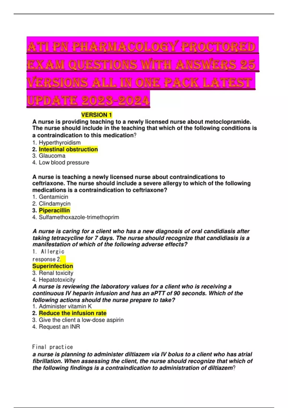 ATI PN PHARMACOLOGY PROCTORED EXAM QUESTIONS WITH ANSWERS 25 VERSIONS ALL IN ONE PACK LATEST UPDATE VERSION 1 A nurse is providing teaching to a newly licensed nurse about metoclopramide. The nurse should include in the teaching that which of the following conditions is a contraindication to this medication? 1. Hyperthyroidism 2. Intestinal obstruction 3. Glaucoma 4. Low blood pressure A nurse is teaching a newly licensed nurse about contraindications to ceftriaxone. The nurse should include a severe allergy to which of the following medications is a contraindication to ceftriaxone? 1. Gentamicin 2. Clindamycin 3. Piperacillin 4. Sulfamethoxazole-trimethoprim A nurse is caring for a client who has a new diagnosis of oral candidiasis after taking tetracycline for 7 days. The nurse should recognize that candidiasis is a manifestation of which of the following adverse effects? 1. Allergic response 2. Superinfection 3. Renal toxicity 4. Hepatotoxicity A nurse is reviewing the laboratory values for a client who is receiving a continuous IV heparin infusion and has an aPTT of 90 seconds. Which of the following actions should the nurse prepare to take? 1. Administer vitamin K 2. Reduce the infusion rate 3. Give the client a low-dose aspirin 4. Request an INR Final practice a nurse is planning to administer diltiazem via IV bolus to a client who has atrial fibrillation. When assessing the client, the nurse should recognize that which of the following findings is a contraindication to administration of diltiazem? hypotension tachycardia decreased level of consciousness history of diuretic use A nurse is administering subcutaneous heparin to a client who is at risk for deep vein thrombosis. Which of the following actions should the nurse take? 1. Administer the medication into the client's abdomen. 2. Inject the medication into a muscle. 3. Massage the site after administering the medication.