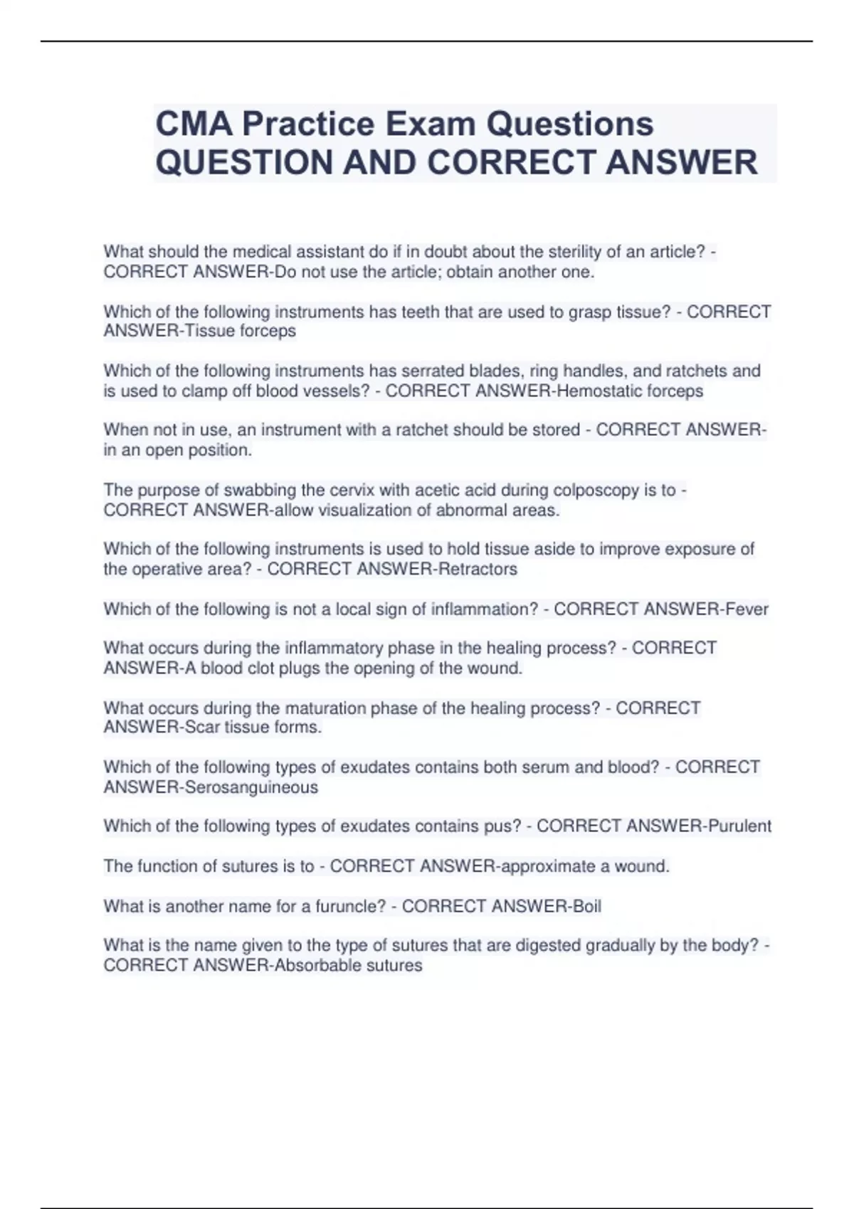 CMA Practice Exam Questions QUESTION AND CORRECT ANSWER What should the medical assistant do if in doubt about the sterility of an article? - CORRECT ANSWER-Do not use the article; obtain another one. Which of the following instruments has teeth that are used to grasp tissue? - CORRECT ANSWER-Tissue forceps Which of the following instruments has serrated blades, ring handles, and ratchets and is used to clamp off blood vessels? - CORRECT ANSWER-Hemostatic forceps When not in use, an instrument with a ratchet should be stored - CORRECT ANSWERin an open position. The purpose of swabbing the cervix with acetic acid during colposcopy is to - CORRECT ANSWER-allow visualization of abnormal areas. Which of the following instruments is used to hold tissue aside to improve exposure of the operative area? - CORRECT ANSWER-Retractors Which of the following is not a local sign of inflammation? - CORRECT ANSWER-Fever What occurs during the inflammatory phase in the healing process? - CORRECT ANSWER-A blood clot plugs the opening of the wound. What occurs during the maturation phase of the healing process? - CORRECT ANSWER-Scar tissue forms. Which of the following types of exudates contains both serum and blood? - CORRECT ANSWER-Serosanguineous Which of the following types of exudates contains pus? - CORRECT ANSWER-Purulent The function of sutures is to - CORRECT ANSWER-approximate a wound. What is another name for a furuncle? - CORRECT ANSWER-Boil What is the name given to the type of sutures that are digested gradually by the body? - CORRECT ANSWER-Absorbable sutures All of the following are characteristics of benign moles except - CORRECT ANSWERpainful and tender. All of the following are characteristics of dysplastic nevi except - CORRECT ANSWERalways develop into malignant melanoma. The purpose of inserting gauze packing after incising a localized infection is to - CORRECT ANSWER-facilitate drainage of the exudate. All of the following are examples of materials used for nonabsorbable sutures except - CORRECT ANSWER-surgical gut. What type of suture needle has a sharp point? - CORRECT ANSWER-Cutting What information is found on the label of a swaged suture packet? - CORRECT ANSWER-a. Type of suture material b. Length and gauge of the suture material c. Type of needle point d. Shape of suture needle Correct. All of the above The purpose of adding epinephrine to a local anesthetic is to - CORRECT ANSWERprolong the effect of the anesthetic. Sutures inserted into the arms or legs are usually removed after - CORRECT ANSWER-7 to 14 days. Which of the following is not a characteristic of a sebaceous cyst? - CORRECT ANSWER-It usually occurs on the palms of the hands and soles of the feet. What would a physician do if a sebaceous cyst is infected? - CORRECT ANSWERIncise and drain the cyst. Shave excision is often used to remove - CORRECT ANSWER-skin tags. What is an abscess? - CORRECT ANSWER-A collection of pus in a cavity surrounded by inflamed tissue Laser mole surgery is used to remove - CORRECT ANSWER-small or flat moles. A biopsy is usually performed to - CORRECT ANSWER-determine whether a tumor is benign or malignant. Cryosurgery can be used to - CORRECT ANSWER-remove warts and skin tags. Cryosurgery is used most often for the treatment of - CORRECT ANSWER-cervical dysplasia. Which of the following is not a postoperative instruction for cryosurgery? - CORRECT ANSWER-Use tampons to absorb drainage. Which of the following bandage turns is used to anchor a bandage? - CORRECT ANSWER-Circular turn The Z-track method is used to administer medications that are - CORRECT ANSWERirritating to subcutaneous tissue. Cardiac glycoside - CORRECT ANSWER-Increases strength and force of myocardial contractions and slows heart rate The abbreviation for "left eye" is - CORRECT ANSWER-OS - The abbreviation for left eye is "OS" (oculis sinister). The first three digits of the ICD code are helpful in - CORRECT ANSWER-Locating the general area in which the code can be found The "Pap" smear is the primary diagnostic test for cancer of the - CORRECT ANSWERCervix - The Pap (Papanicolaou) smear is used for the early detection of cervical cancer. Adopting the feelings of others best describes - CORRECT ANSWER-Introjection An electrocardiogram is a recording of - CORRECT ANSWER-The electrical action of the heart in relation to time All of the following should be considered in evaluating an employee except - CORRECT ANSWER-Comments and observations made by other staff members The type of urine specimen to be collected to test for a urinary tract infection should be - CORRECT ANSWER-Clean-catch specimen The plan that pays the primary doctor monthly, quarterly, semiannual, or annual payments in return for providing all care to the patient, including visits to specialists, is - CORRECT ANSWER-Capitation The type of urine specimen collected for culture and sensitivity testing is a - CORRECT ANSWER-Clean-catch midstream specimen A business envelope - CORRECT ANSWER-Is 9½ inches long Blood specimens collected for culture are collected in a sterile evacuated tube with a - CORRECT ANSWER-Yellow top - Tubes with yellow tops are sterile and used for collection of specimens for blood culture. According to the AMA Code of Ethics, all of the following are permitted by ethical standards except - CORRECT ANSWER-Euthanasia The needle gauge that should be used for a patient with very small veins is - CORRECT ANSWER-22 gauge - Needles for venipuncture range from 20G to 22G. Any smaller size could damage the cells and hemolize the specimen. The system used by the U.S. Department of Health and Human Services for the coding of procedures that are covered by federal insurance is the - CORRECT ANSWERHCPCS If a person who has ingested poison is transported to the hospital, the patient may be given a substance in the emergency department to prevent the poison from being absorbed in the gastrointestinal tract. This substance is - CORRECT ANSWERActivated c