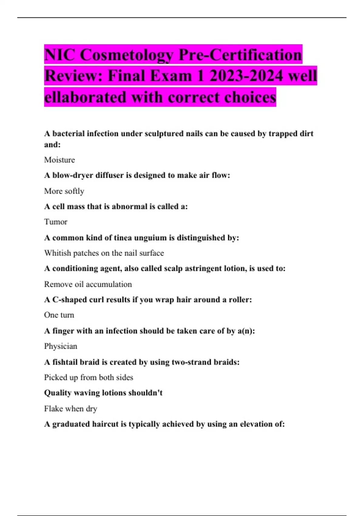 NIC Cosmetology Pre-Certification Review: Final Exam well ellaborated with correct choices