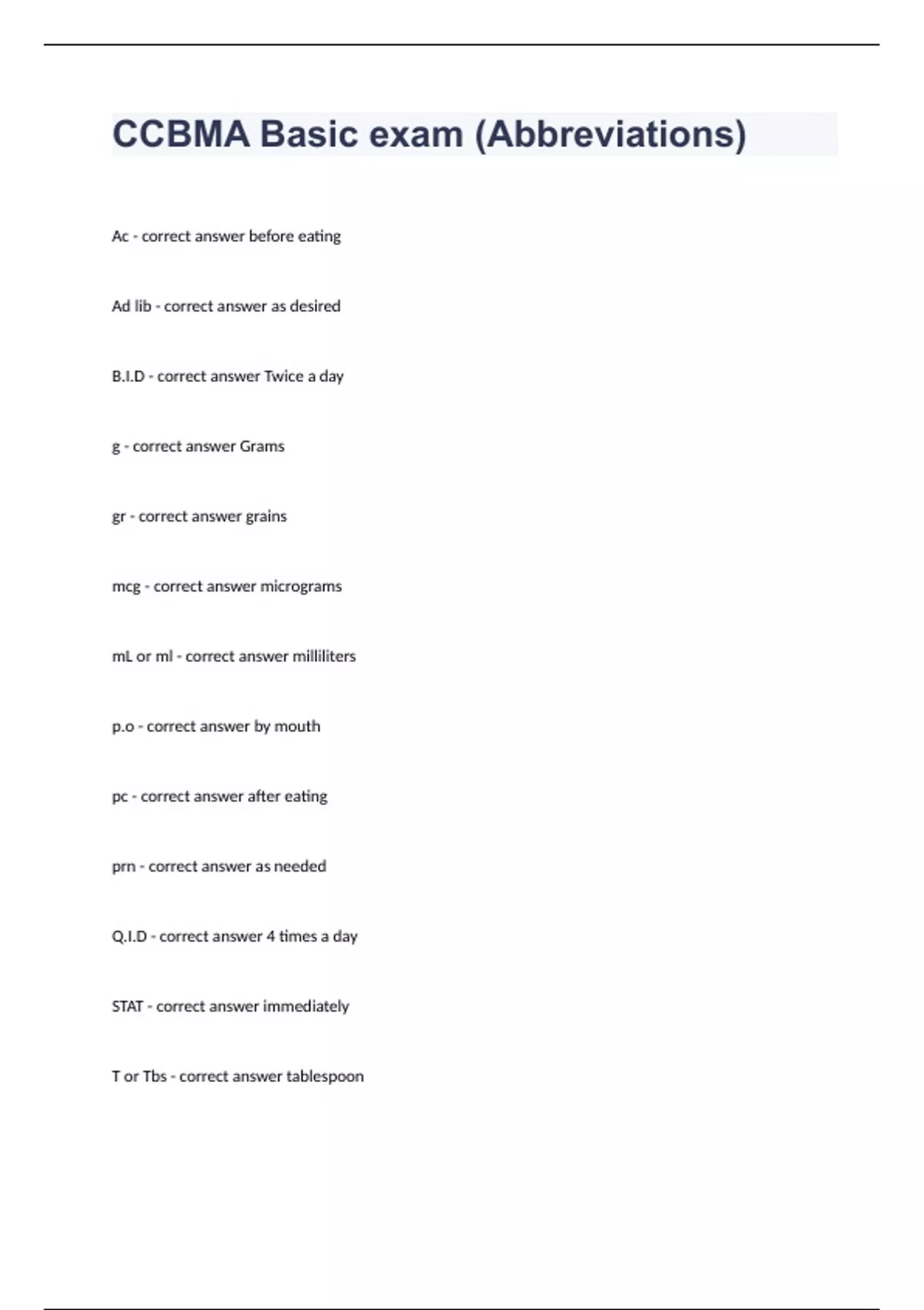 CCBMA Basic exam (Abbreviations)questions n answers rated A+