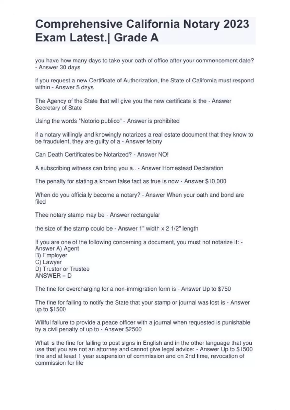 Comprehensive California Notary 2023 Exam Latest.| Grade A