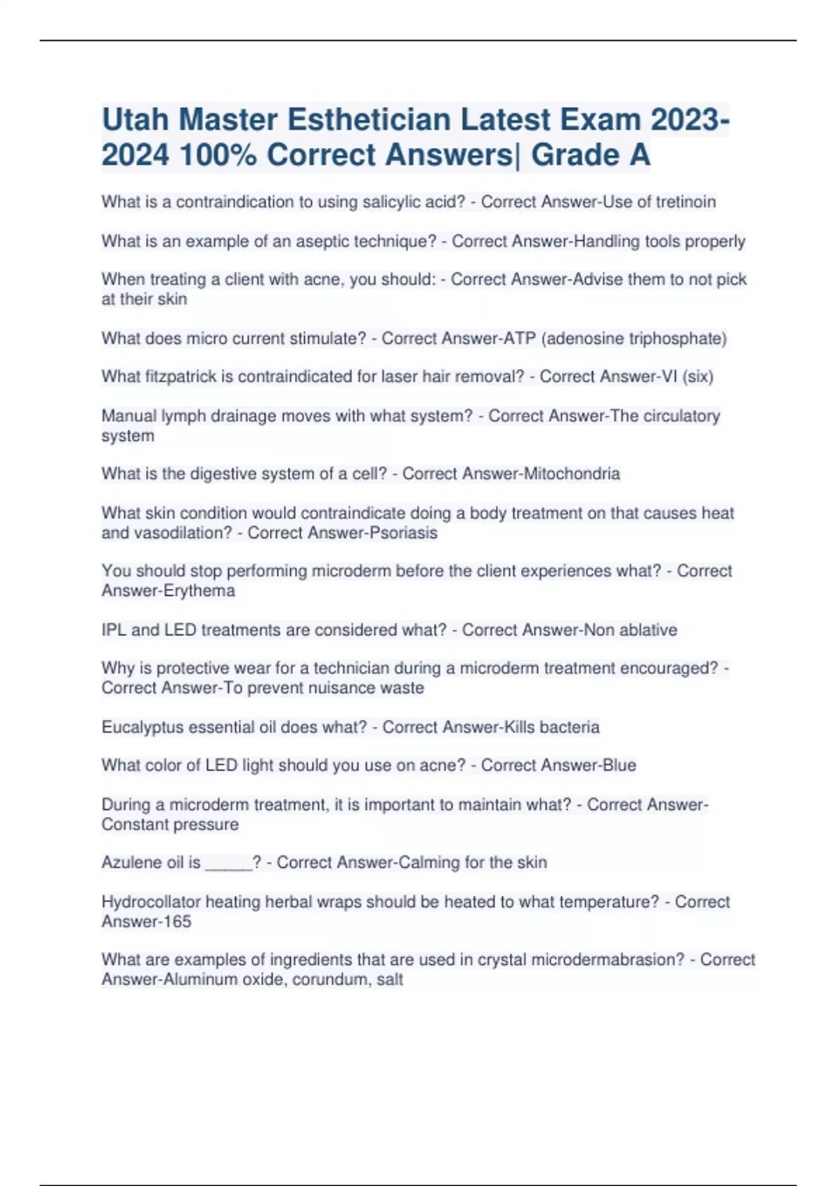 Utah Master Esthetician latest Exam With 100% Correct Answers 2023