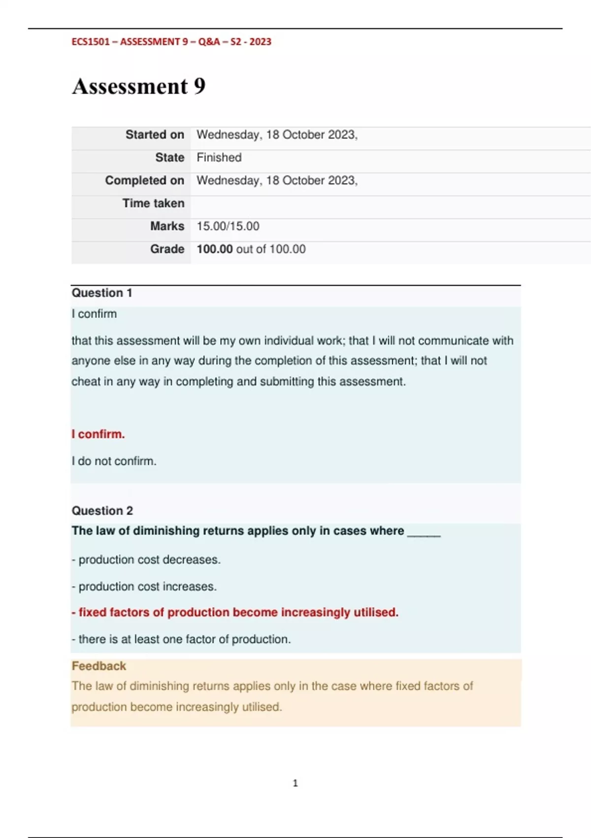 , ECS1501 – ASSESSMENT 9 – Q&A – S2 - 2023