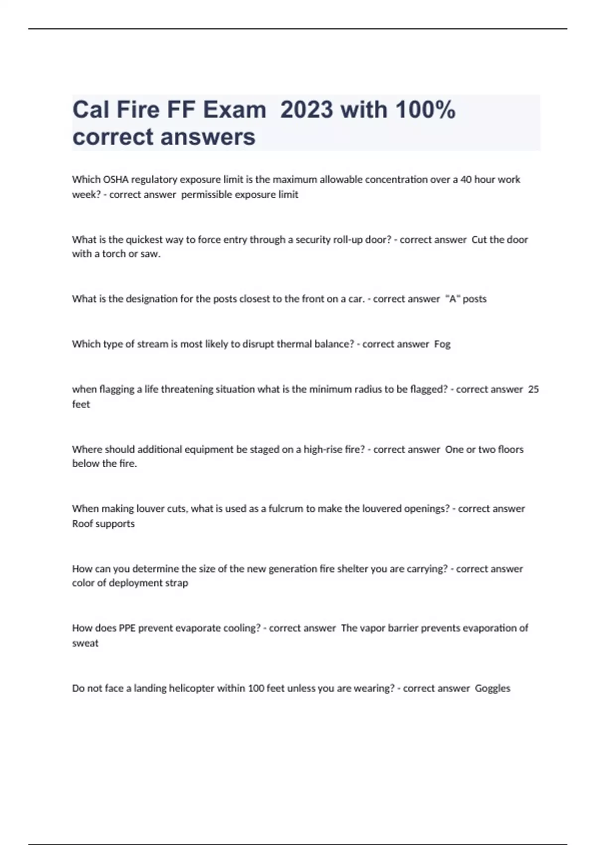 Which OSHA regulatory exposure limit is the maximum allowable concentration over a 40 hour work week? - correct answer permissible exposure limit What is the quickest way to force entry through a security roll-up door? - correct answer Cut the door with a torch or saw. What is the designation for the posts closest to the front on a car. - correct answer "A" posts Which type of stream is most likely to disrupt thermal balance? - correct answer Fog when flagging a life threatening situation what is the minimum radius to be flagged? - correct answer 25 feet Where should additional equipment be staged on a high-rise fire? - correct answer One or two floors below the fire. When making louver cuts, what is used as a fulcrum to make the louvered openings? - correct answer Roof supports How can you determine the size of the new generation fire shelter you are carrying? - correct answer color of deployment strap How does PPE prevent evaporate cooling? - correct answer The vapor barrier prevents evaporation of sweat Do not face a landing helicopter within 100 feet unless you are wearing? - correct answer Goggles Proper spacing between firefighters during handline construction is? - correct answer 10 feet Which of the following safety precautions do not apply to all hand tools when in use? - correct answer