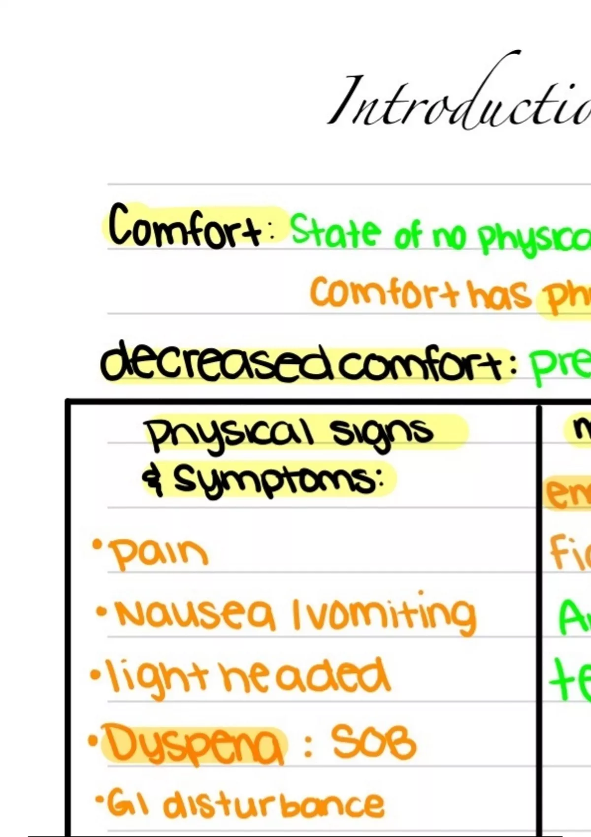 In depth class notes on "Comfort" and discomfort in nursing. Risk factors/causes, what is it, nursing interventions and more! Using goodnotes with pictures and definitions.