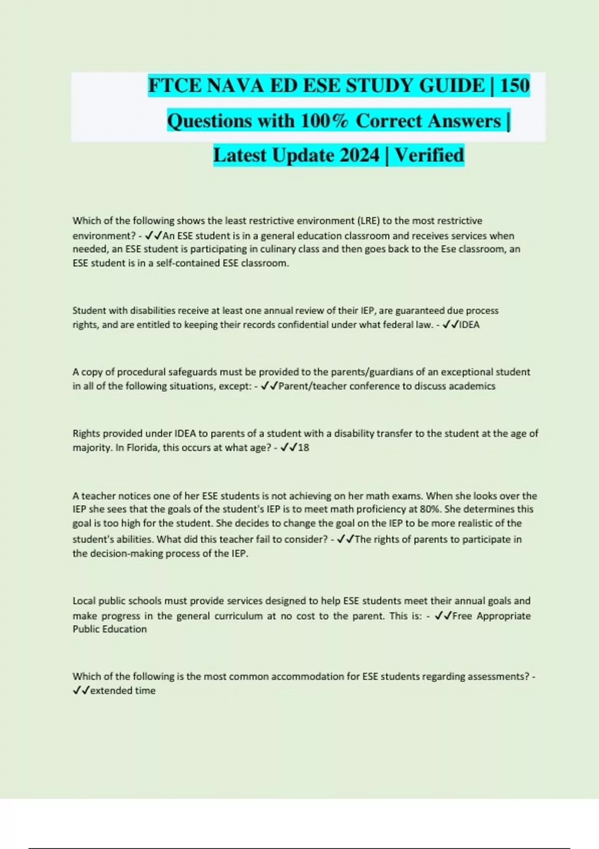 FTCE NAVA ED ESE STUDY GUIDE | 150 Questions with 100% Correct Answers | Latest Update 2024 | Verified