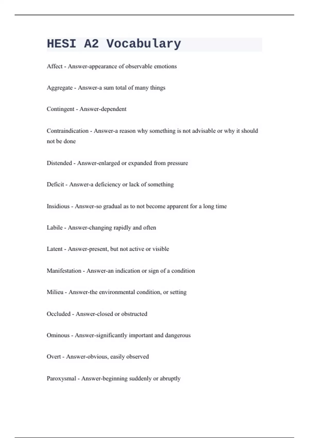 Affect - Answer-appearance of observable emotions Aggregate - Answer-a sum total of many things Contingent - Answer-dependent Contraindication - Answer-a reason why something is not advisable or why it should not be done Distended - Answer-enlarged or expanded from pressure Deficit - Answer-a deficiency or lack of something Insidious - Answer-so gradual as to not become apparent for a long time Labile - Answer-changing rapidly and often Latent - Answer-present, but not active or visible Manifestation - Answer-an indication or sign of a condition Milieu - Answer-the environmental condition, or setting Occluded - Answer-closed or obstructed Ominous - Answer-significantly important and dangerous