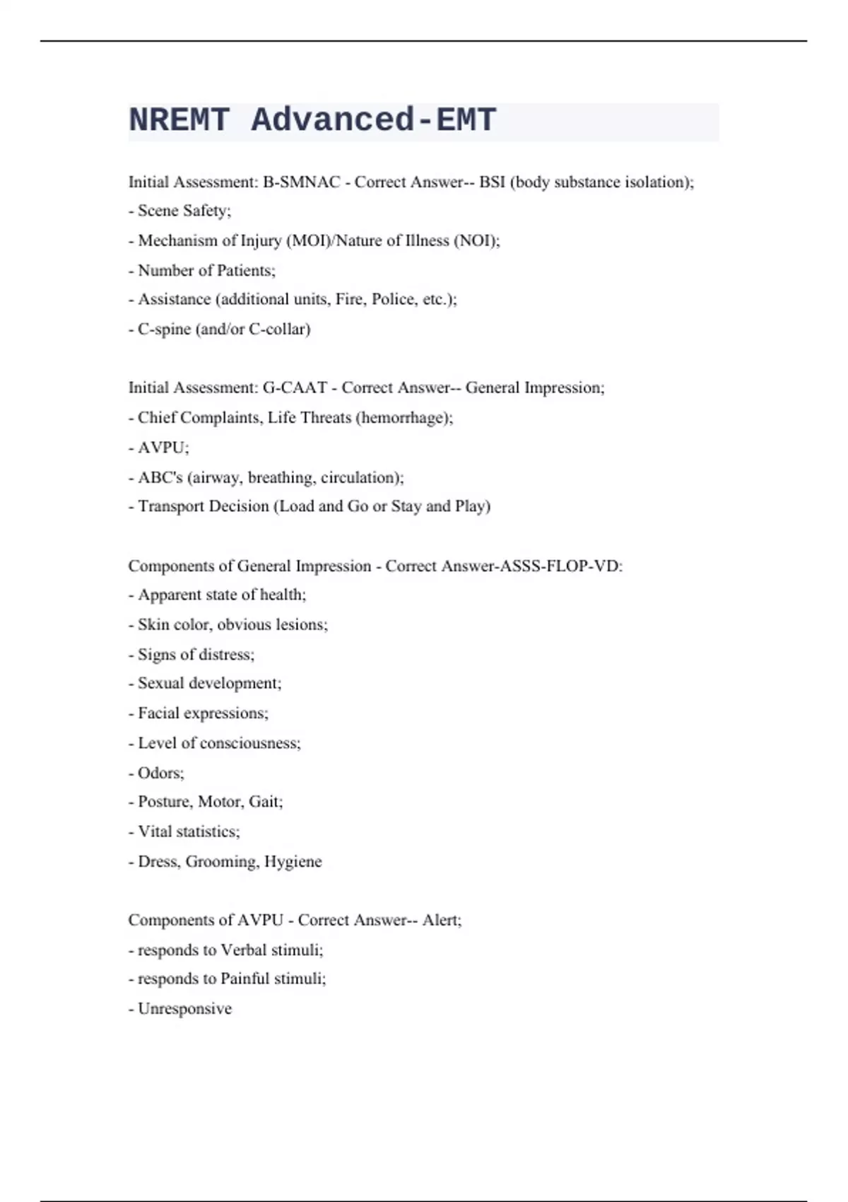Initial Assessment: B-SMNAC - Correct Answer-- BSI (body substance isolation); - Scene Safety; - Mechanism of Injury (MOI)/Nature of Illness (NOI); - Number of Patients; - Assistance (additional units, Fire, Police, etc.); - C-spine (and/or C-collar) Initial Assessment: G-CAAT - Correct Answer-- General Impression; - Chief Complaints, Life Threats (hemorrhage); - AVPU; - ABC's (airway, breathing, circulation); - Transport Decision (Load and Go or Stay and Play) Components of General Impression - Correct Answer-ASSS-FLOP-VD: - Apparent state of health; - Skin color, obvious lesions; - Signs of distress; - Sexual development; - Facial expressions; - Level of consciousness; - Odors; - Posture, Motor, Gait; - Vital statistics; - Dress, Grooming, Hygiene Components of AVPU - Correct Answer-- Alert; - responds to Verbal stimuli; - responds to Painful stimuli; - Unresponsive Secondary Assessment: OPQRST-I - Correct Answer-especially for Respiratory and Cardiac patients: - Onset; - Provocation/Palliation; - Quality; - Radiation; - Scale/Severity; - Time; - Interventions