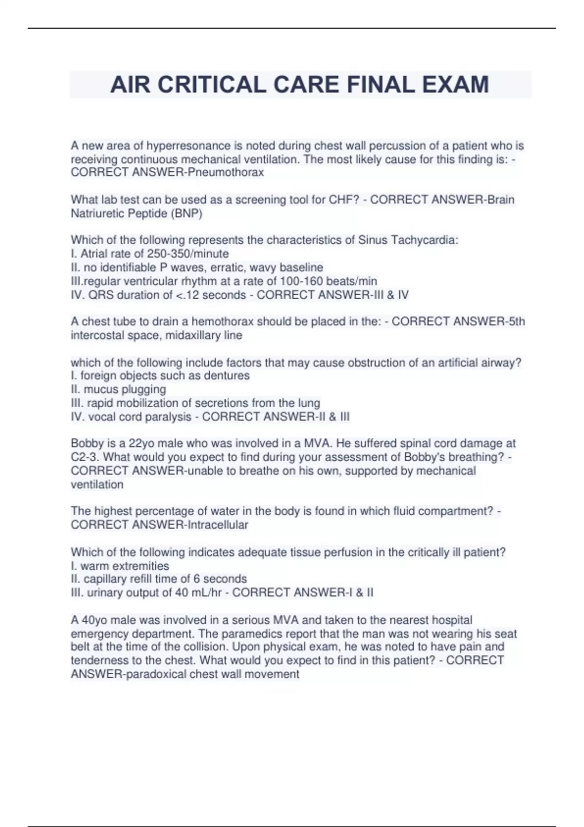 A new area of hyperresonance is noted during chest wall percussion of a patient who is CORRECT ANSWER-Pneumothorax III.regular ventricular rhythm at a rate of 100-160 beats/min tenderness tothe chest. What would you expect to find in this patient? -CORRECT emergency department. The paramedics report that the man was not wearing his seat III. urinary output of 40 mL/hr -CORRECT ANSWER-I & II II. capillary refill time of 6 seconds A 40yo male was involved in a serious MVA and taken to the nearest hospital intercostal space, midaxillary line IV. QRS duration of <.12 seconds -CORRECT ANSWER-III & IV The highest percentage of water in the body is found in which fluid compartment? - CORRECT ANSWER-Intracellular ventilation What lab test can be used as a screening tool for CHF? -CORRECT ANSWER-Brain I. Atrial rate of 250-350/minute IV. vocal cord paralysis -CORRECT ANSWER-II & III CORRECT ANSWER-unable to breathe on his own, supported by mechanical Bobby is a 22yo male who was involved in a MVA. He suffered spinal cord damage at II. no identifiable P waves, erratic, wavy baseline III. rapid mobilization of secretions from the lung II. mucus plugging receiving continuous mechanical ventilation. The most likely cause for this finding is: - Which of the following represents the characteristics of Sinus Tachycardia: Natriuretic Peptide (BNP) I. warm extremities A chest tube to drain a hemothorax should be placed in the: -CORRECT ANSWER-5th I. foreign objects such as dentures C2-3. What would you expect to find during your assessment of Bobby's breathing? - which of the following include factors that may cause obstruction of an artificial airway? Which of the following indicates adequate tissue perfusion in the critically ill patient? belt at the time of the collision. Upon physical exam, he was noted to have pain and ANSWER-paradoxical chest wall movement