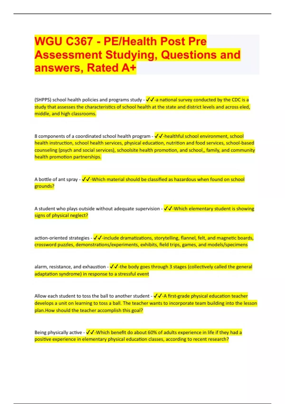 WGU C367 - PE/Health Post Pre Assessment Studying, Questions and answers, Rated A+ 2024