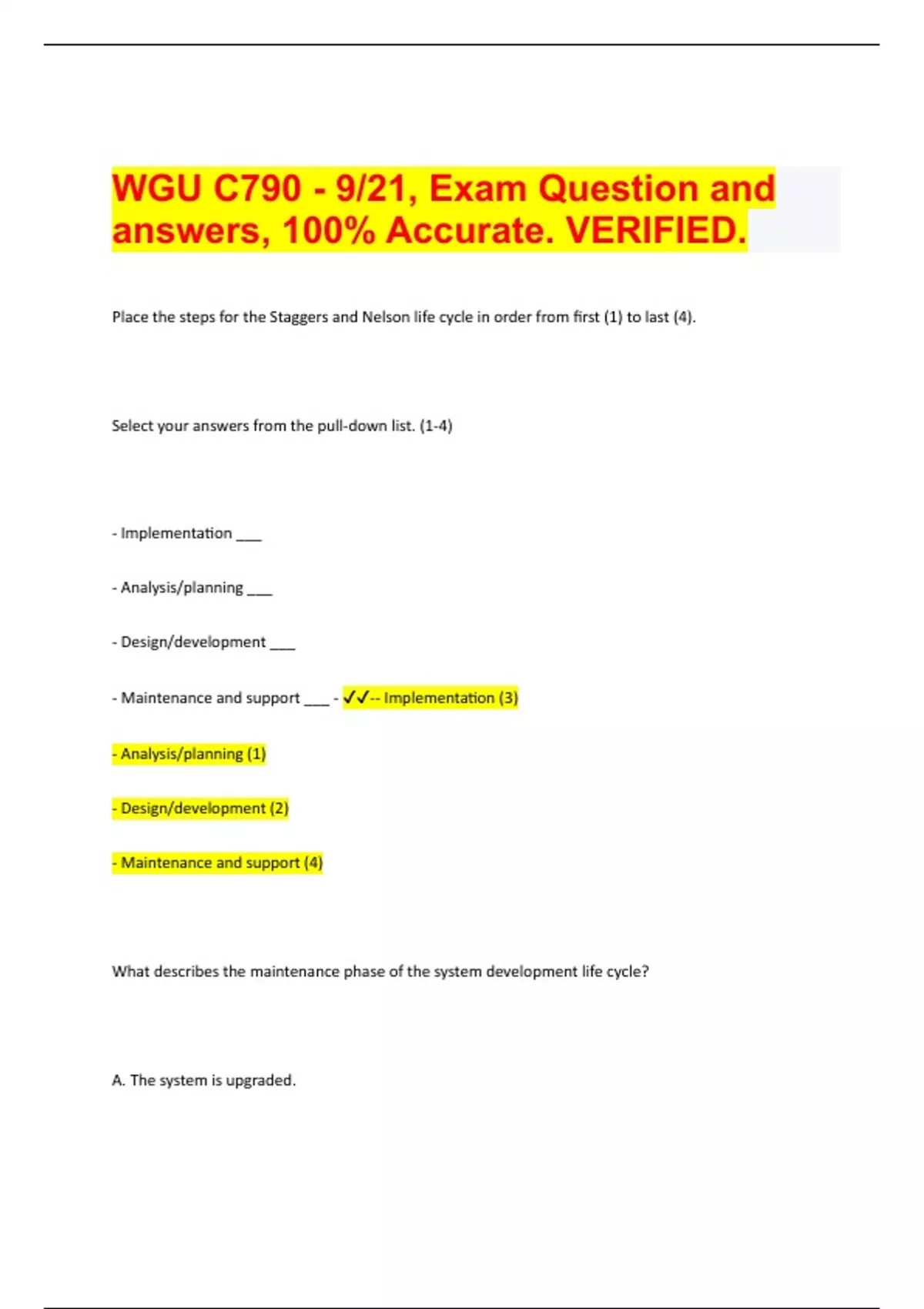Place the steps for the Staggers and Nelson life cycle in order from first (1) to last (4). Select your answers from the pull-down list. (1-4) - Implementation ___ - Analysis/planning ___ - Design/development ___ - Maintenance and support ___ - -- Implementation (3) - Analysis/planning (1) - Design/development (2) - Maintenance and support (4) What describes the maintenance phase of the system development life cycle? A. The system is upgraded.