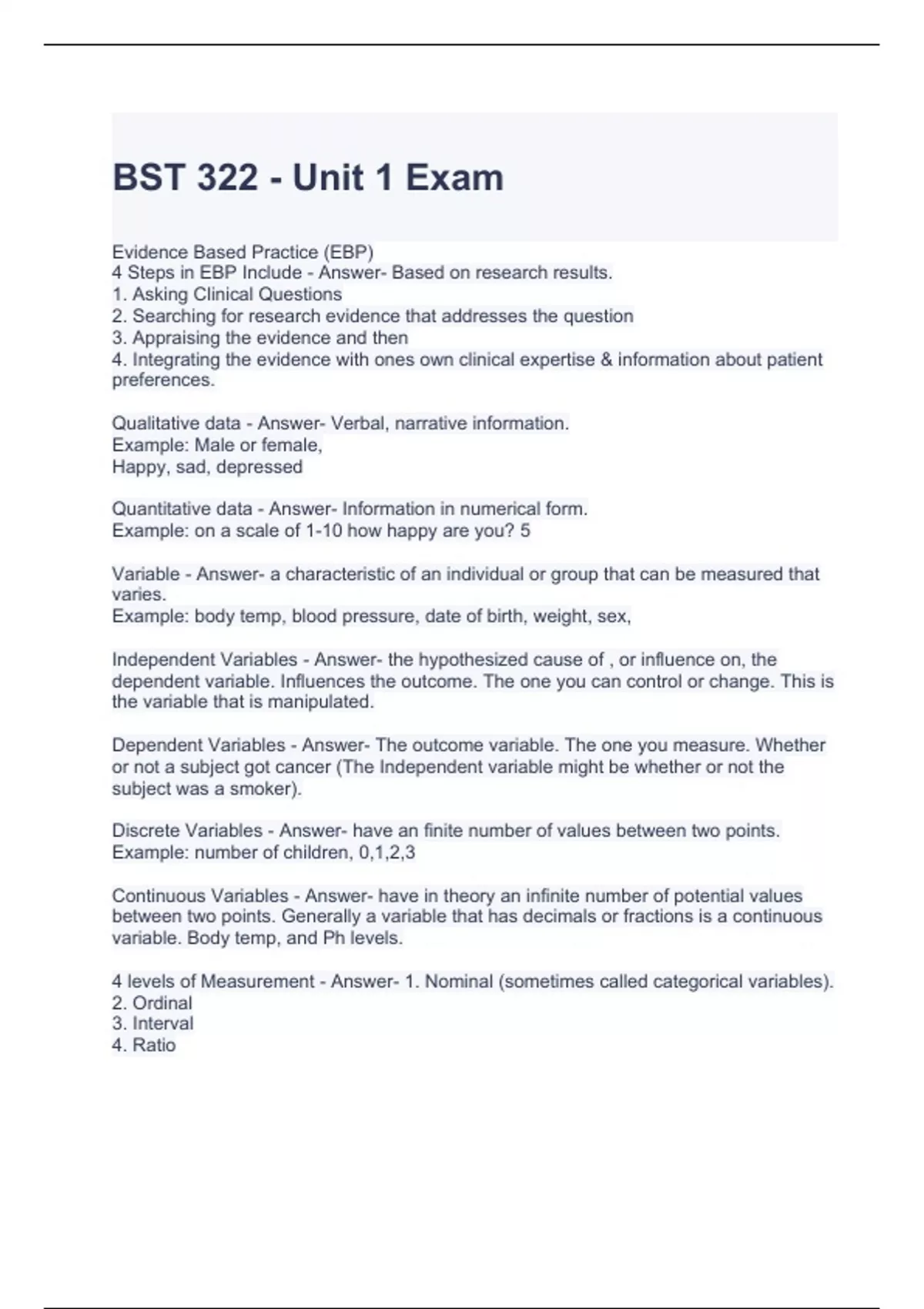 BST 322 - Unit 1 Exam with complete solutions