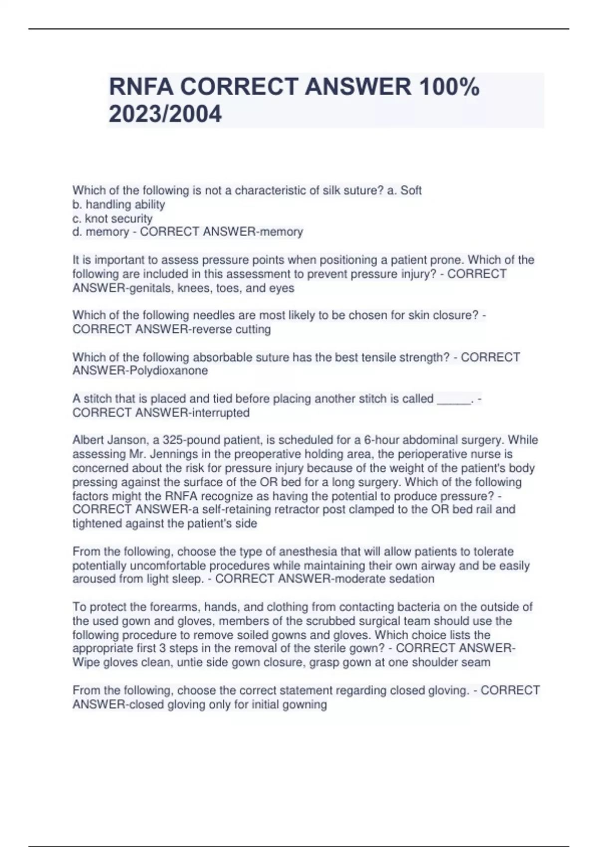 RNFA CORRECT ANSWER 100% 2023/2004 Which of the following is not a characteristic of silk suture? a. Soft b. handling ability c. knot security d. memory - CORRECT ANSWER-memory It is important to assess pressure points when positioning a patient prone. Which of the following are included in this assessment to prevent pressure injury? - CORRECT ANSWER-genitals, knees, toes, and eyes Which of the following needles are most likely to be chosen for skin closure? - CORRECT ANSWER-reverse cutting Which of the following absorbable suture has the best tensile strength? - CORRECT ANSWER-Polydioxanone A stitch that is placed and tied before placing another stitch is called _____. - CORRECT ANSWER-interrupted Albert Janson, a 325-pound patient, is scheduled for a 6-hour abdominal surgery. While assessing Mr. Jennings in the preoperative holding area, the perioperative nurse is concerned about the risk for pressure injury because of the weight of the patient's body pressing against the surface of the OR bed for a long surgery. Which of the following factors might the RNFA recognize as having the potential to produce pressure? - CORRECT ANSWER-a self-retaining retractor post clamped to the OR bed rail and tightened against the patient's side From the following, choose the type of anesthesia that will allow patients to tolerate potentially uncomfortable procedures while maintaining their own airway and be easily aroused from light sleep. - CORRECT ANSWER-moderate sedation To protect the forearms, hands, and clothing from contacting bacteria on the outside of the used gown and gloves, members of the scrubbed surgical team should use the following procedure to remove soiled gowns and gloves. Which choice lists the appropriate first 3 steps in the removal of the sterile gown? - CORRECT ANSWERWipe gloves clean, untie side gown closure, grasp gown at one shoulder seam From the following, choose the correct statement regarding closed gloving. - CORRECT ANSWER-closed gloving only for initial gowning While Fowler's position offers the best respiratory excursion for the patient, the patient is at higher risk for _______ because of dependent pooling in the hips and legs. - CORRECT ANSWER-Venous thrombosis Proper care and handling of surgical specimens is imperative for correct diagnosis, treatment, and prognosis planning of the patient. Select the response that best reflects correct specimen care and handling. - CORRECT ANSWER-avoid placing specimen in formalin The intracorporeal suture technique uses the suture-tying process analogous to the: - CORRECT ANSWER-instrument tie High-pressure insufflation rates can cause overpressurization of the intra-abdominal cavity. This overpressurization can lead to which of the following? - CORRECT ANSWER-hypercarbaria Which statement best explains the mechanism of action of general anesthetic agents? - CORRECT ANSWER-inhibition of synaptic transmission of nerve impulse Which statement about surgical dressings is true? - CORRECT ANSWER-Surgical dressings cushion and protect the wound from trauma and gross contamination, and absorb drainage The surgeon used the ESU in monopolar mode to cut and coagulate through the subcutaneous tissue on opening the abdomen during a bariatric bypass procedure. As she began to proceed through the muscle and fascia layer, she asked the circulating nurse to increase the cut and coagulation modes on the ESU. What measure could the scrub person take to enhance energy delivery? - CORRECT ANSWER-Clean the charred tissue from the active electrode blade Which of the following is correct regarding the chromium salt coating on surgical gut suture? - CORRECT ANSWER-Should be rinsed from the suture before use in eye cases Successful employment of the time-out can only be ensured when: - CORRECT ANSWER-the entire team stops and focuses attention together A 19-year-old male received an intravenous peripheral nerve block for an ORIF of an ankle fracture. The anesthesia provider injected a distal dorsal vein of the patient's right foot with 2% lidocaine, after placing a single cuffed pneumatic tourniquet around the upper thigh. The surgeon noticed that the cuff seemed to be deflating and anticipated that the patient would initially complain of which of the following? - CORRECT ANSWER-metallic taste in mouth Which of the following patients would be most likely to have a latex allergy? - CORRECT ANSWER-spina bifida patient In several studies, it was determined that the risk of contamination and subsequent infection to the wearer can be reduced by wearing two pairs of sterile surgical gloves, as opposed to wearing one pair. Select the correct statement that refers to double gloving in terms of a best practice. - CORRECT ANSWER-The American College of Surgeons endorses double gloving for all surgery and invasive procedures. During the process of performing the spinal, the anesthesia provider inadvertently inserted the spinal needle into the subarachnoid space, not noticing the error until the entire syringe of lidocaine was emptied into the patient. The patient immediately experienced rapid onset of hypotension, bradycardia, and apnea. The resulting condition is called _______ and now must be managed with ________. - CORRECT ANSWER-total spinal anesthesia; general endotracheal anesthesia During the preliminary sponge count on closure of a repair of a ruptured abdominal aortic aneurysm, the circulating nurse was unable to account for 2 lap sponges. Select the appropriate communication that the circulating nurse must employ in addressing the entire team during this count discrepancy. - CORRECT ANSWER-"We have a count discrepancy. We started with 70 sponges and find only 68. We are missing 2 lap sponges." When creating a vascular or intestinal anastomosis, the surgeon will typically suture one half of the anastomosis with one half of the suture and the other half of the anastomosis with the other half of the suture. This technique minimizes the drag and wear on the 