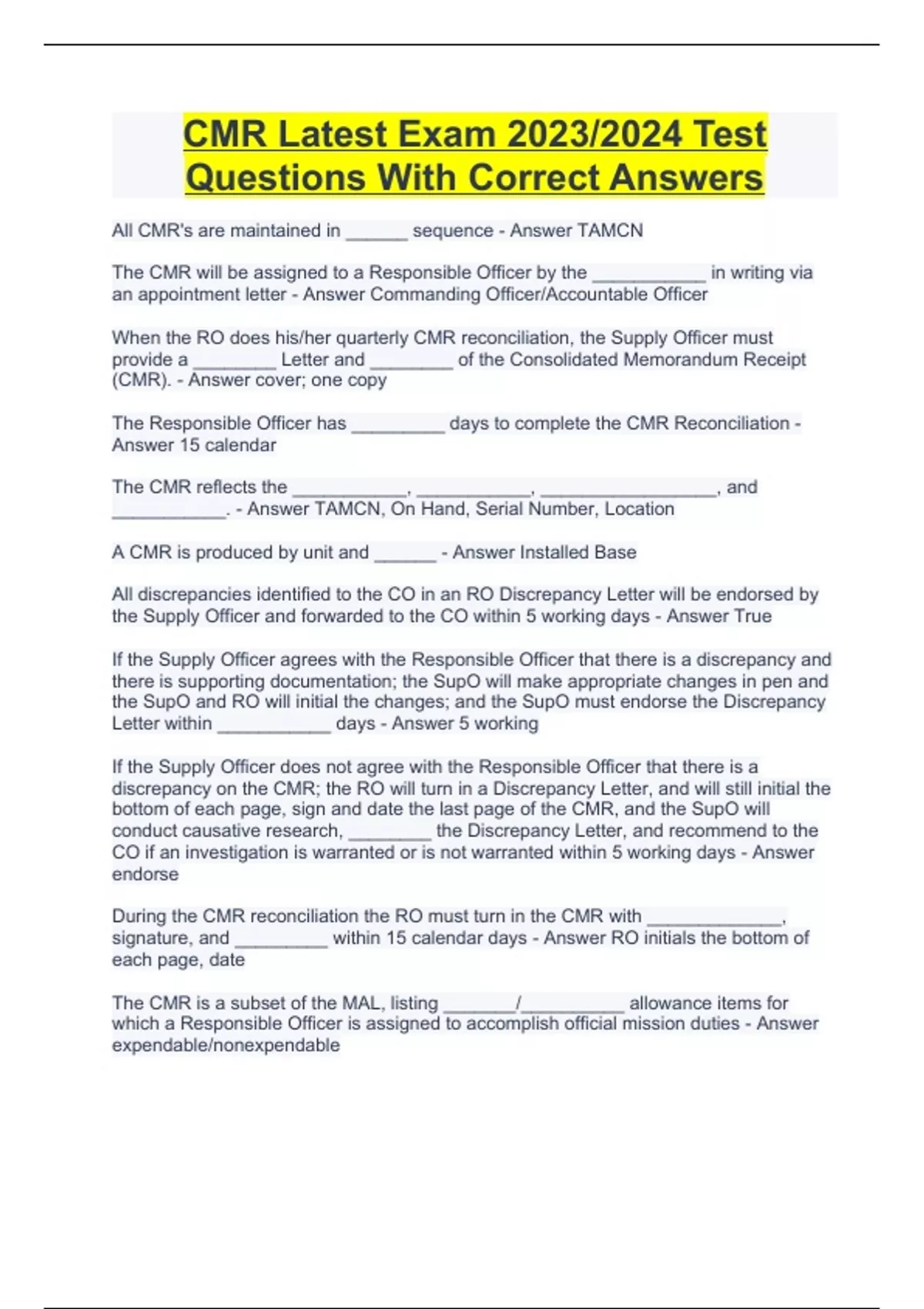CMR Latest Exam 2023/2024 Test Questions With Correct Answers