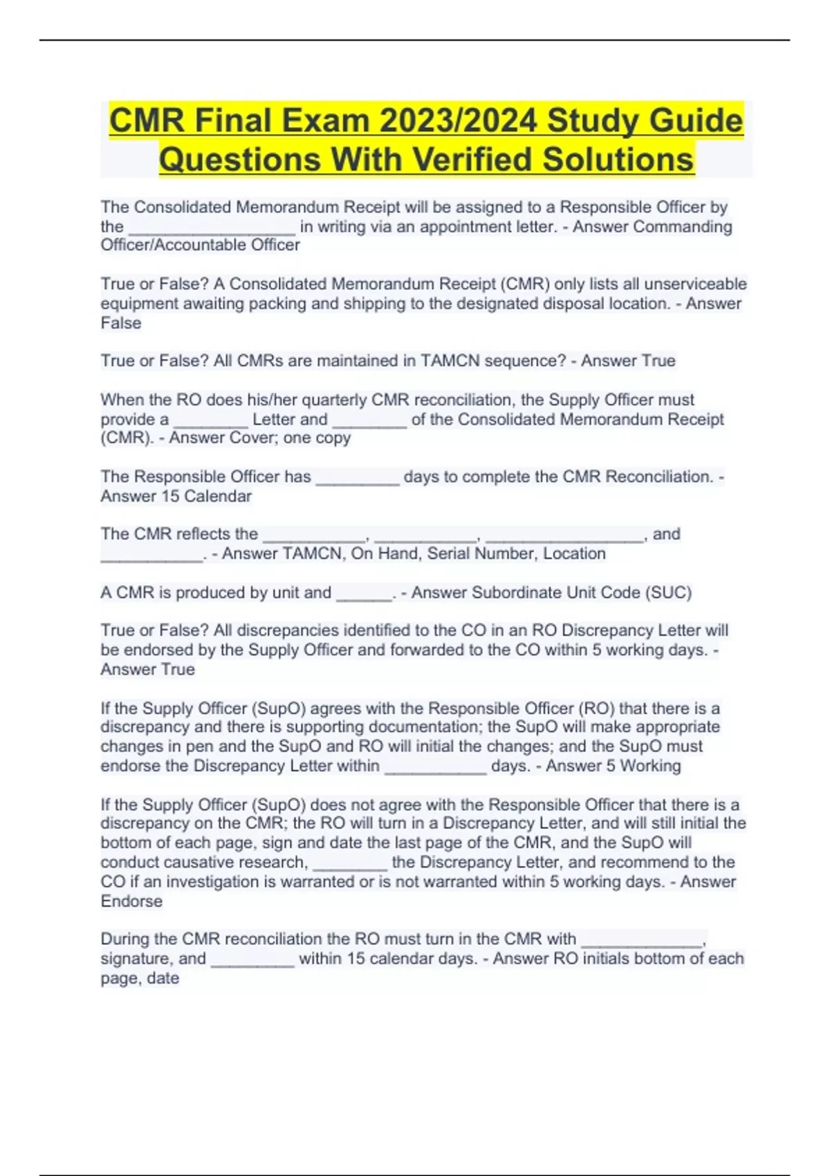 CMR Final Exam 2023/2024 Study Guide Questions With Verified Solutions