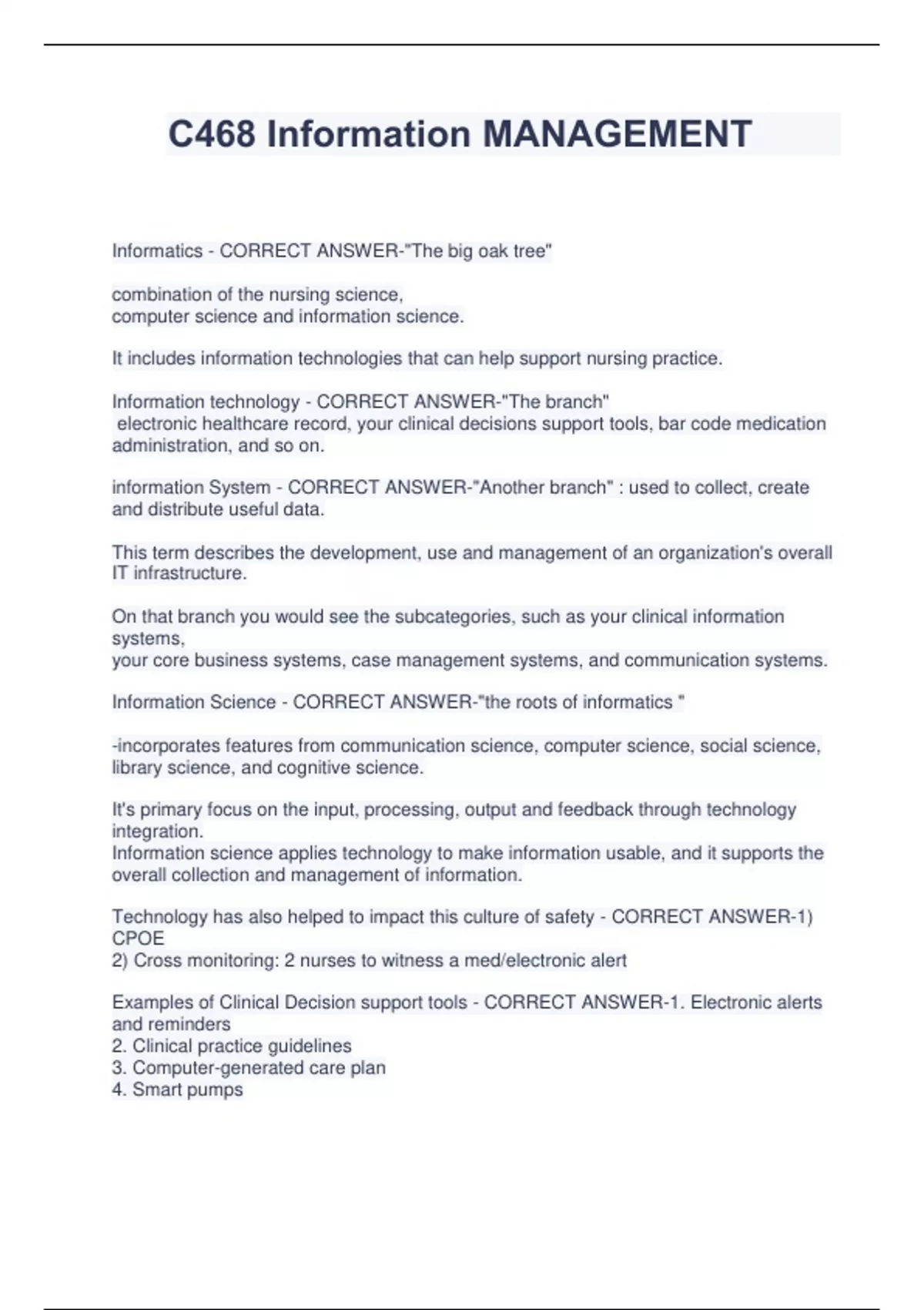 C468 Information MANAGEMENT Informatics - CORRECT ANSWER-"The big oak tree" combination of the nursing science, computer science and information science. It includes information technologies that can help support nursing practice. Information technology - CORRECT ANSWER-"The branch" electronic healthcare record, your clinical decisions support tools, bar code medication administration, and so on. information System - CORRECT ANSWER-"Another branch" : used to collect, create and distribute useful data. This term describes the development, use and management of an organization's overall IT infrastructure. On that branch you would see the subcategories, such as your clinical information systems, your core business systems, case management systems, and communication systems. Information Science - CORRECT ANSWER-"the roots of informatics " -incorporates features from communication science, computer science, social science, library science, and cognitive science. It's primary focus on the input, processing, output and feedback through technology integration. Information science applies technology to make information usable, and it supports the overall collection and management of information. Technology has also helped to impact this culture of safety - CORRECT ANSWER-1) CPOE 2) Cross monitoring: 2 nurses to witness a med/electronic alert Examples of Clinical Decision support tools - CORRECT ANSWER-1. Electronic alerts and reminders 2. Clinical practice guidelines 3. Computer-generated care plan 4. Smart pumps 5. EHR: drug reference guide 6. Clinical pathways Information Security - CORRECT ANSWER-greatest potential threats are right now: 1. unauthorized personnel getting access to the equipment. 2. the use of removable storage devices (flash drive to dl info) 2 governing authorities that obligate nurses to protect patient information? - CORRECT ANSWER-HIPPA (pt's can have a copy of their record/make corrections) ANA Code of Ethics Examples of Logically Protecting pt's information - CORRECT ANSWER-installing **Firewall protection Biometrics (scanning fingerprint) Authentication (user specific password) Automatic sign offs Examples of physically protecting pt's info - CORRECT ANSWER-Surveillance Cameras Restricted Areas Shredding hard copies three principles that help to make up an organization culture as *safety* - CORRECT ANSWER-1) Commitment of resources 2) Cross-collaboration 3) Blame-free environment store and forward technology. - CORRECT ANSWER-a form of transferring data or images from one location to another (radiology images, pathology reports) Reasoning of Growth of telehealth - CORRECT ANSWER-1. access to care 2. continuity of care 3. ratio of patients to providers 4. increase in chronic disease EHR Takes patient-specific info: 1. Recommends something (example: recheck BP) **2. Compares it against set of rules or knowledge base - CORRECT ANSWERLegal and ethical of telehealth nursing - CORRECT ANSWER-- Extensive documentation (prevent malpractice) - Licensed in every state that they practice telehealth Identify Clinical vs. non-clinical telehealth - CORRECT ANSWER-Clinical: to directly affect care of pt -(ex: chest x-ray) -type of mobile device -live video conferencing (check proper injection administration) Non-clinical: - Team meeting - Research - Video-conferencing (not used for pt) -professional development online There are two main approaches to the development of these information systems: - CORRECT ANSWER-1) Nursing Process Approach (admission/dc, progress notes, data collection, safe med admin..) 2) Critical Pathway/Protocols: allows nurses and multidisciplinary team members to access the relevant information in the system Nursing Process Approach - CORRECT ANSWER--Streamlines documentation of assessments and patient-related data. -Provides discharge information and pertinent patient education materials and resources. -Provides medication information to help prevent medication errors or interactions. Critical Pathways/Protocols Approach - CORRECT ANSWER--Physician's orders are present for the multidisciplinary care team to observe and follow. -Allows the multidisciplinary care team to update the plan of care when variances in the patient's condition are noted. -Multidisciplinary team members can contribute to care plans along the care continuum. What are three types of clinical information systems? (in critical pathways approach) - CORRECT ANSWER-Monitoring system Order entry system Laboratory system Definition of Nursing informatics - CORRECT ANSWER-The integration of nursing science, computer science, and information science to manage and communicate data, information, knowledge, and wisdom into nursing practice Informatics Nurse Specialist (INS) - CORRECT ANSWER-a nurse who has received educational preparation to conduct informatics research and generate informatics theory and who has a broad vision of what can be attained using information technology. How does computer literacy differ from information literacy? - CORRECT ANSWERComputer literacy: familiarity with the use of personal computers information literacy: ability to recognize when info is needed as well as the skills to find, evaluate, and use needed information effectively distance learning - CORRECT ANSWER-The delivery of content and stimulation of learning primarily through the use of telecommunication technologies and often used for corporate training virtual reality - CORRECT ANSWER-It is a widely used form of multimedia that fully envelops learners in an environment providing the next best option to performing the skill on a real person but without any risks to the learner or the client Computer resistance by nurses is often the result of which of the following? - CORRECT ANSWER-computer anxiety, limited computer skills, and poor communication on the part of administration to consult nurses during the change process An order entry system can do all of the following except - CORRECT ANSWERIntegrate results of 