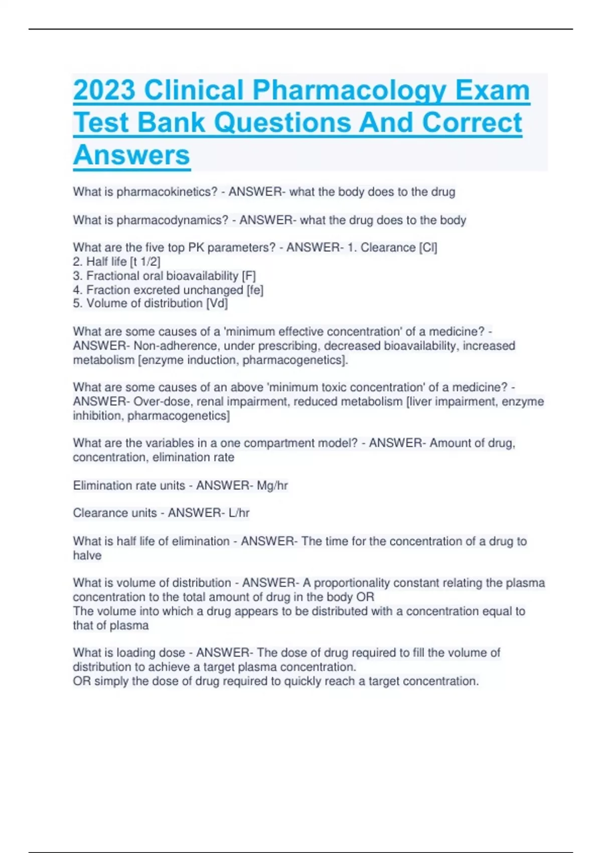 2023 Clinical Pharmacology Exam Test Bank Questions And Correct Answers What is pharmacokinetics? - ANSWER- what the body does to the drug What is pharmacodynamics? - ANSWER- what the drug does to the body What are the five top PK parameters? - ANSWER- 1. Clearance [Cl] 2. Half life [t 1/2] 3. Fractional oral bioavailability [F] 4. Fraction excreted unchanged [fe] 5. Volume of distribution [Vd] What are some causes of a 'minimum effective concentration' of a medicine? - ANSWER- Non-adherence, under prescribing, decreased bioavailability, increased metabolism [enzyme induction, pharmacogenetics]. What are some causes of an above 'minimum toxic concentration' of a medicine? - ANSWER- Over-dose, renal impairment, reduced metabolism [liver impairment, enzyme inhibition, pharmacogenetics] What are the variables in a one compartment model? - ANSWER- Amount of drug, concentration, elimination rate Elimination rate units - ANSWER- Mg/hr Clearance units - ANSWER- L/hr What is half life of elimination - ANSWER- The time for the concentration of a drug to halve What is volume of distribution - ANSWER- A proportionality constant relating the plasma concentration to the total amount of drug in the body OR The volume into which a drug appears to be distributed with a concentration equal to that of plasma What is loading dose - ANSWER- The dose of drug required to fill the volume of distribution to achieve a target plasma concentration. OR simply the dose of drug required to quickly reach a target concentration. What can increased volume of distribution - ANSWER- Large size, leaky membranes [eg sepsis due to vasodilation and capillary leak], change in body composition [eg oedema], decreased plasma protein binding [liver/renal failure or drug interactions]. Provide an example of a maintenance dose rate - ANSWER- Paracetamol oral 1g four times a day Rate of elimination [RE] equation - ANSWER- RE [mg/hr] = Cl [L/hr] x Cp [mg/L] What is the best index of drug exposure - ANSWER- Area under the concentration-time curve What is the significance of t 1/2 - ANSWER- Important for calculating dose interval and the time to steady state (4-5 half lifes) What is metabolism - ANSWER- Drug metabolism is the enzymatic conversion of one chemical (drug) into another (metabolite). It usually involves converting a biologically active molecule to one or more biologically inactive molecules [s]. Fractional oral availability - ANSWER- The proportion of the drug that reaches the systemic circulation following an oral dose. It has no units, it is a proportion often expressed as a %. What is the clinical relevance of Vd - ANSWER- Allows determination of the amount of drug in the body required to achieve a target concentration and hence the loading dose. What is the primary determinant of maintenance dose rate - ANSWER- Drug clearance What is the clinical relevance of clearance - ANSWER- Drug clearance determines allows the determination of the rate of elimination and hence the maintenance dose rate to achieve a target drug exposure [AUC] for an individual. Vd and Cl are two important parameters. Discuss the variability in renal dysfunction - ANSWER- Clearance is decreased for drugs that are renally cleared unchanged. Metabolised drugs are not affected. Vd - renal disease is associated with smaller Vd for drugs with low protein binding and larger Vd for drugs with high protein binding. Vd and Cl are two important parameters. Discuss the variability in relation to pharmacogenetics - ANSWER- Cl - for drugs metabolised by pathways subject to polymorphisms this is dependent on the particular genotype, which may result in phenotypes including poor metabolisers, extensive metabolisers and ultrametabolisers. Generally no effect is expected for drugs that are renally cleared unchanged. Vd - generally no effect is expected. Vd and Cl are two important parameters. Discuss the variability in relation to obesity - ANSWER- Cl - this is increased in absolut terms (ie unit volume per unit time) but is reduced on a per kg of total body weight basis. Vd - decreased for hydrophilic drugs and increased for lipophilic drugs on a per kg of total body weight basis. What is clearance - ANSWER- A constant relating the rate of elimination to plasma concentration. More specifically for drugs with first order elimination, drug clearance is the capacity of the body to remove the drug from circulation, measured by the volume of plasma from which a substance is completely removed per unit of time. What is the best index of drug exposure - ANSWER- Area under the concentration-time curve [AUC] What are efflux transporters? - ANSWER- Efflux transporters actively transport lipid soluble drugs away from the body What are solute transporters? - ANSWER- Solute transporters move anions and cations in both directions across cell membranes What happens if you decrease function or inhibit efflux transporters - ANSWERDecreased efflux means that more drug is retained. - increased intracellular conc