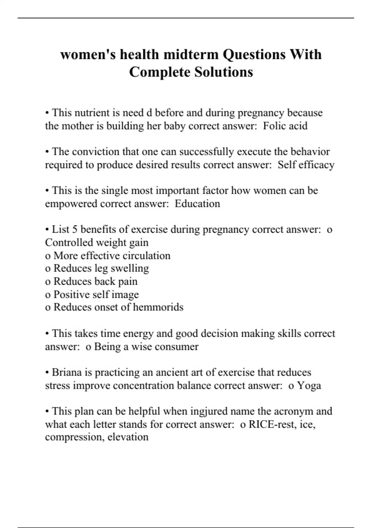 • This nutrient is need d before and during pregnancy because the mother is building her baby correct answer: Folic acid • The conviction that one can successfully execute the behavior required to produce desired results correct answer: Self efficacy • This is the single most important factor how women can be empowered correct answer: Education • List 5 benefits of exercise during pregnancy correct answer: o Controlled weight gain o More effective circulation o Reduces leg swelling o Reduces back pain o Positive self image o Reduces onset of hemmorids • This takes time energy and good decision making skills correct answer: o Being a wise consumer • Briana is practicing an ancient art of exercise that reduces stress improve concentration balance correct answer: o Yoga • This plan can be helpful when ingjured name the acronym and what each letter stands for correct answer: o RICE-rest, ice, compression, elevation • Lycopene favanols anthocyanins correct answer: o Phytochemicals • These are slowly digested and contain vitamins minerals fiber and phytochemicals correct answer: o The right carbs • This model suggests that you wile experience stages as you attempt to change your health behavior over time correct answer: o Transtheroetical model • In 1963 legislation passed that requires lal employers to pay all employees equally for equal work correct answer: o The equal pay act • One of the most common recognizable women from eh womens suffrage movement and delivered many speeches on womens rights correct answer: o Susan b Anthony • This phase of your work out prepares the body for a more effective workout and helps prevent injury correct answer: o The warm up • I am 38 years old and my max target heart rate is correct answer: o 182 (220-age) • Hydrogenated and man made correct answer: o Trans fats • The six dimensions of wellness correct answer: o Emotional o Spiritual o Social o Physical o Environmental o Intellectual • This is a hatred of women correct answer: o Misogyny • Most Americans consume a diet typically highest in this macronutrient correct answer: o Carbs • Nurses physical therapists physicians assistants pharmacists nurse practitioner correct answer: o Ancillary practitioner • This is the first comprehensive study of health issues for women correct answer: o Nurses health study • This disease of the central nervous system casuses a loss of myelin correct answer: o Multiple sclerosis • This has a profound and lasting impact every aspect of your health and being correct answer: o Diet • Producing or showing no symptoms correct answer: o Asymptomatic • This group of women account for more than one half of all women living with AIDS there are two groups correct answer: o African American and Hispanic women • The name of the vaccine that has been recommended for girls and women to prevent HPV correct answer: o Guardisil • This disease increase the risk of skeletal fracture cause by loss of bone density correct answer: o Osteoporosis • This type of medicine reportedly exceeds the total number of visits to all primary care physician correct answer: o Alternative care medicine • These types of excises are better for pregnant women correct answer: o Water aerobics o Dance o Cycling o Pilates • This can be most helpful when you need to select a health care provider correct answer: o Ask friends or relatives for recommendations • This autoimmune disease causes inflammation and affects the vital organs correct answer: o Lupus • Nothing provides longer lasting and more effective appetite control correct answer: o Protein • The first line of protection against future sterility? correct answer: o Abstinence • These are the principles of conditioning or the prescription for excersice correct answer: o FIT • Frequency • Intensity • Time • Type • This virus can reactivate in adults and cause shingles correct answer: o Chicken pox • This is the leading cause of death for women aged 15-34 years correct answer: o Unintentional injury • List tree different ways to measure body composition correct answer: o Bod pod o Calipers o Hydrostatic o Electrical impedance • Advertising techniques that portray sports celebrities actors medical personnel or rock groups stating the attributes of products they get paid to correct answer: o Endorsements or testimonials • Chicken pox, genital herpes mono are all part of which common virus family correct answer: o Herpes simplex • This is the most common sexually transmitted infection in the US correct answer: o Chlamydia • The promotion of a medical remedy that doesn't work correct answer: o Health quackery Atherosclerosis correct answer: gradual thickening and hardening of the artery walls two major nutrients needed to prevent osteoporosis correct answer: vitamin d and calcium
