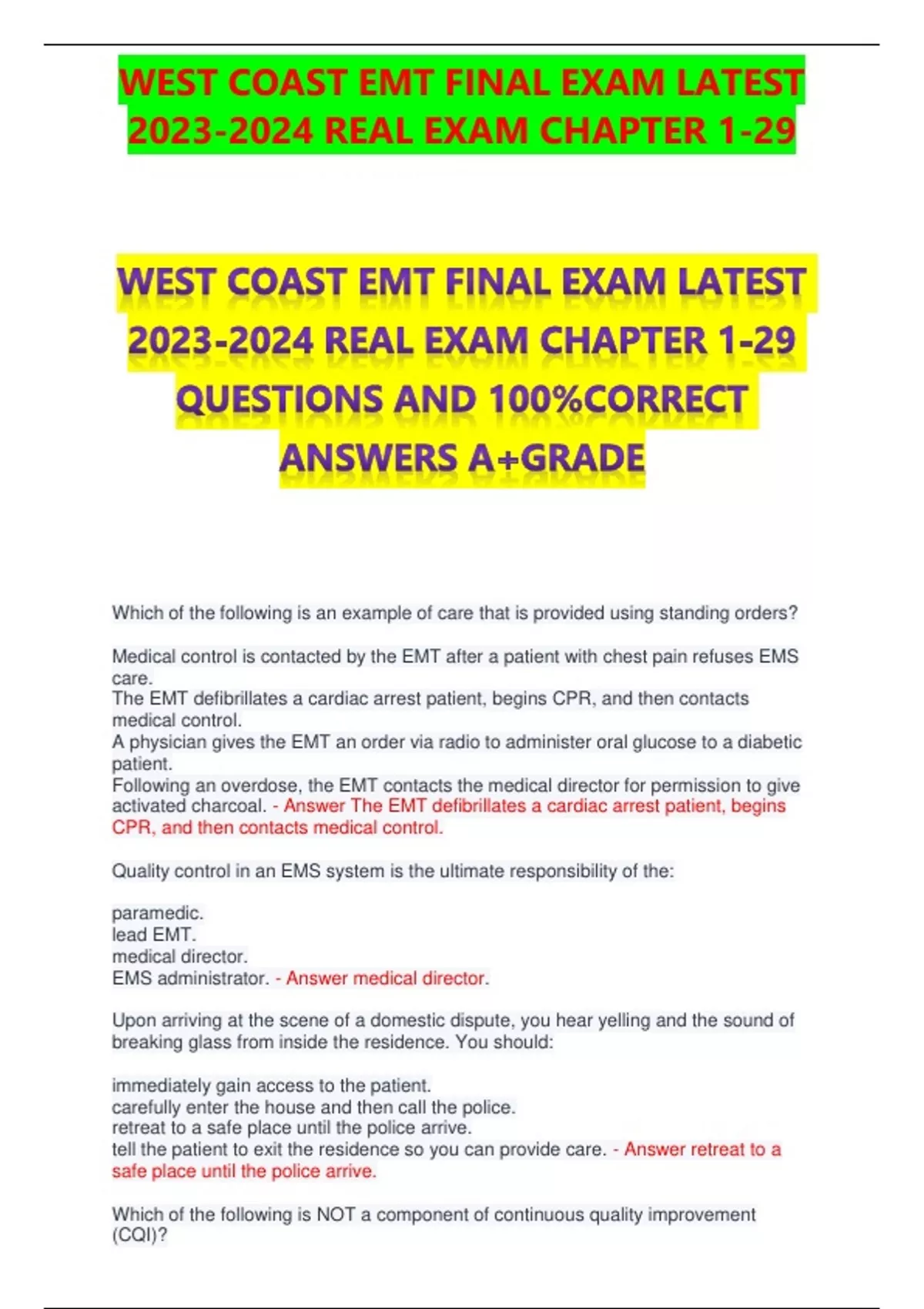 WEST COAST EMT FINAL EXAM LATEST REAL EXAM CHAPTER 1-29 QUESTIONS AND 100%CORRECT ANSWERS A+GRADE Which of the following is an example of care that is provided using standing orders? Medical control is contacted by the EMT after a patient with chest pain refuses EMS care. The EMT defibrillates a cardiac arrest patient, begins CPR, and then contacts medical control. A physician gives the EMT an order via radio to administer oral glucose to a diabetic patient. Following an overdose, the EMT contacts the medical director for permission to give activated charcoal. - Answer The EMT defibrillates a cardiac arrest patient, begins CPR, and then contacts medical control. Quality control in an EMS system is the ultimate responsibility of the: paramedic. lead EMT. medical director. EMS administrator. - Answer medical director. Upon arriving at the scene of a domestic dispute, you hear yelling and the sound of breaking glass from inside the residence. You should: immediately gain access to the patient. carefully enter the house and then call the police. retreat to a safe place until the police arrive. tell the patient to exit the residence so you can provide care. - Answer retreat to a safe place until the police arrive. Which of the following is NOT a component of continuous quality improvement (CQI)? Periodic review of run reports Discussion of needs for improvement Negative feedback to those who make mistakes while on a call Remedial training as deemed necessary by the medical director - Answer Negative feedback to those who make mistakes while on a call All of the following are responsibilities of the EMS medical director, EXCEPT: evaluating patient insurance information. serving as liaison with the medical community. ensuring that the appropriate standards are met by EMTs. ensuring appropriate EMT education and continuing training. - Answer evaluating patient insurance information. Which of the following situations would MOST likely disqualify a person for EMS certification? A misdemeanor at the age of 17 Driving under the influence of alcohol Possessing a valid driver's license from another state A mild hearing impairment that is corrected with hearing aids - Answer Driving under the influence of alcohol Which of the following should be the EMT's highest priority? Controlling severe bleeding Maintaining a patient's airway Ensuring patient safety Ensuring personal safety - Answer Ensuring personal safety A patient who requires cardiac monitoring in the field would require, at a minimum, which level of EMS provider?. EMR EMT Paramedic AEMT - Answer Paramedic Which of the following is a professional responsibility of the EMT? Telling the family of a dying patient that everything will be OK Maintaining only the skills that the EMT feels uncomfortable with Maintaining a professional demeanor even under the most stressful situations Advising an emergency department nurse that patient reports are given only to a physician - Answer Maintaining a professional demeanor even under the most stressful situations Emergency patient care occurs in progressive phases. What occurs first? Activation of EMS Initial prehospital care The patient receives definitive care Incident recognition - Answer Incident recognition American Heart Association protocols are based on . Select one: A. theories ready for field trial B. trends in the EMS community C. evidence-based research D. opinions from a core group of cardiologists - Answer C. Evidence-based research As an EMT, you may be authorized to administer aspirin to a patient with chest pain based on: Select one: A. medical director approval. B. the transport time to the hospital. C. the patient's condition. D. an order from a paramedic. - Answer A. Medical director approval