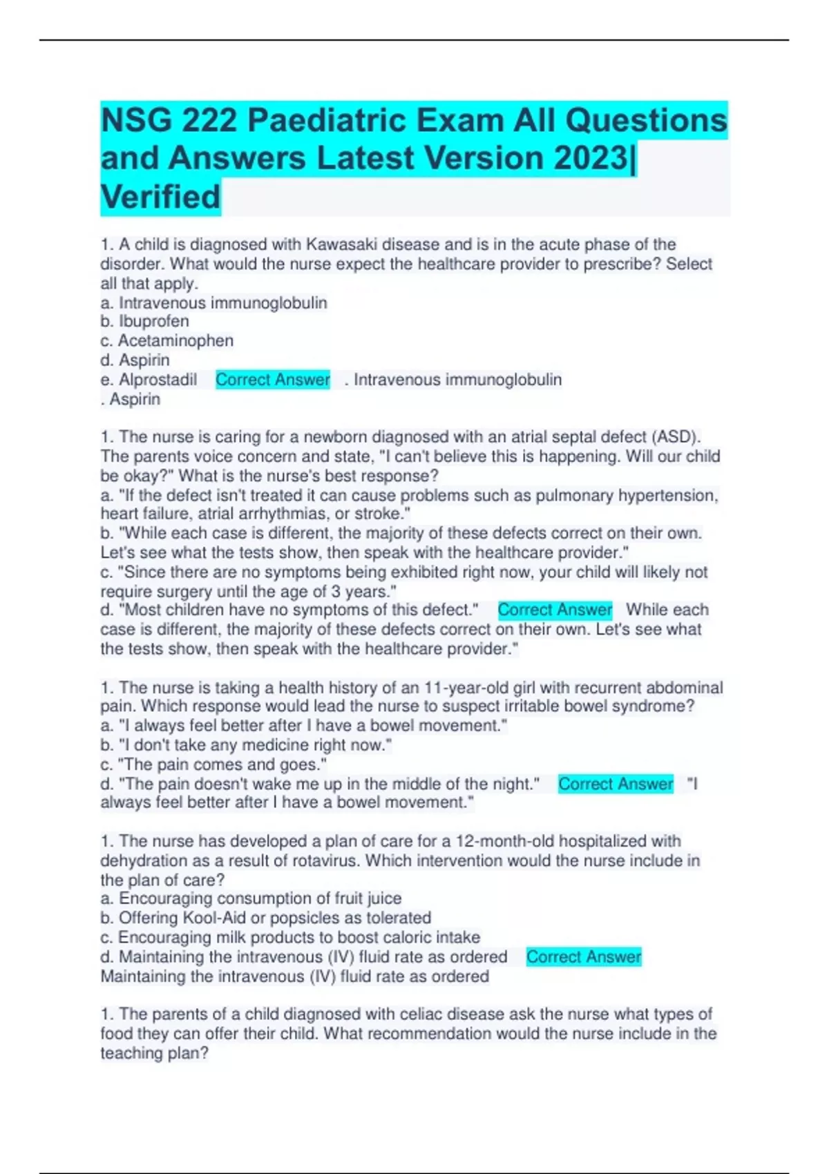 NSG222 Paediatric Exam All Questions and Answers Latest Version 2023