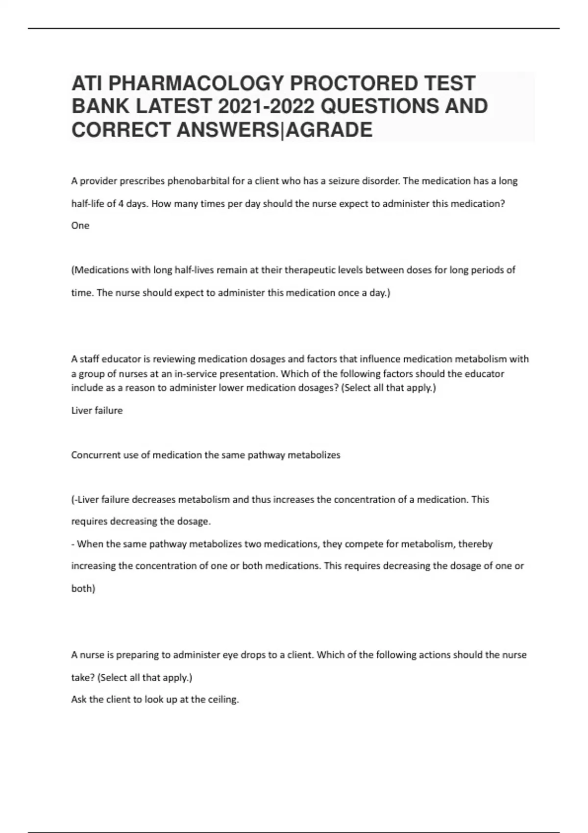 ATI PHARMACOLOGY PROCTORED TEST BANK LATEST QUESTIONS AND CORRECT ANSWERS|AGRADE A provider prescribes phenobarbital for a client who has a seizure disorder. The medication has a long half-life of 4 days. How many times per day should the nurse expect to administer this medication? One (Medications with long half-lives remain at their therapeutic levels between doses for long periods of time. The nurse should expect to administer this medication once a day.) A staff educator is reviewing medication dosages and factors that influence medication metabolism with a group of nurses at an in-service presentation. Which of the following factors should the educator include as a reason to administer lower medication dosages? (Select all that apply.) Liver failure Concurrent use of medication the same pathway metabolizes (-Liver failure decreases metabolism and thus increases the concentration of a medication. This requires decreasing the dosage. - When the same pathway metabolizes two medications, they compete for metabolism, thereby increasing the concentration of one or both medications. This requires decreasing the dosage of one or both) A nurse is preparing to administer eye drops to a client. Which of the following actions should the nurse take? (Select all that apply.) Ask the client to look up at the ceiling. Drop the medication into the center of the client's conjunctival sac. Instruct the client to close her eye gently after instillation