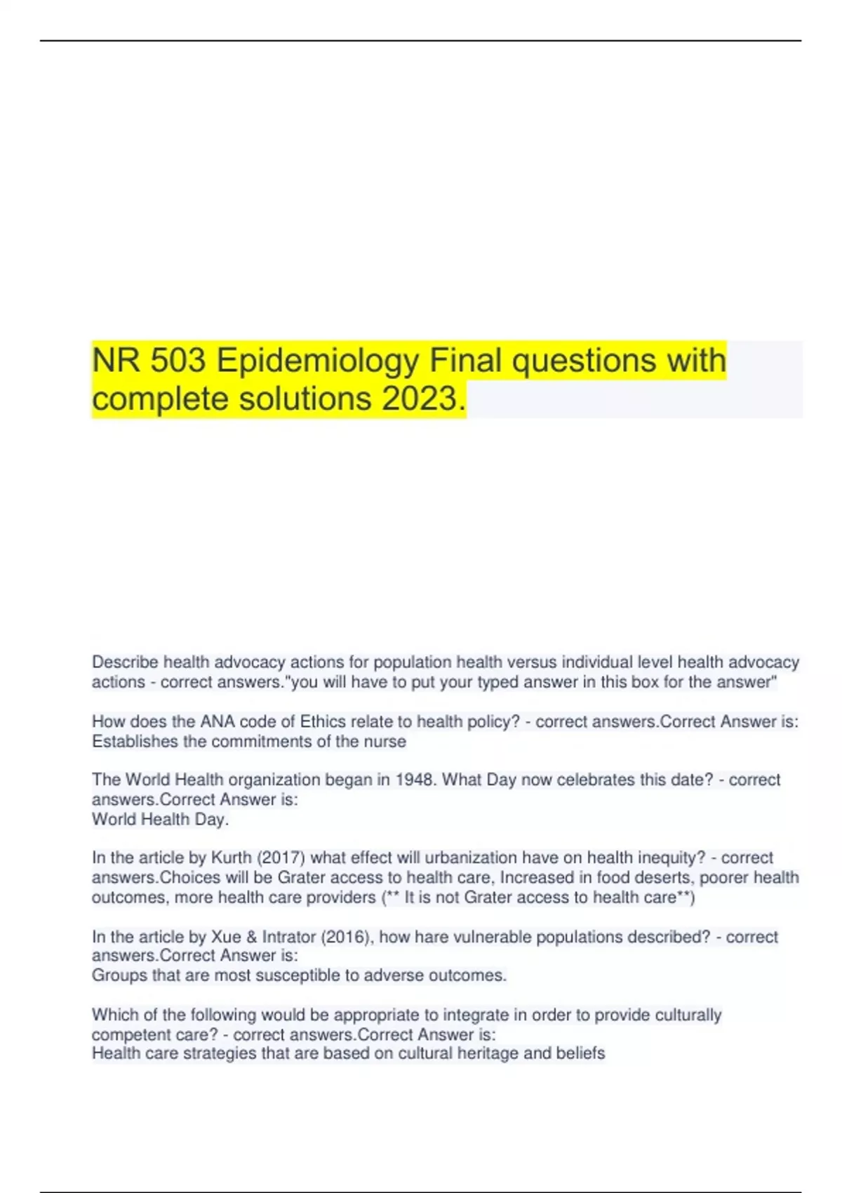 NR 503 Epidemiology Final questions with complete solutions 2023. Describe health advocacy actions for population health versus individual level health advocacy actions - correct answers."you will have to put your typed answer in this box for the answer" How does the ANA code of Ethics relate to health policy? - correct answers.Correct Answer is: Establishes the commitments of the nurse The World Health organization began in 1948. What Day now celebrates this date? - correct answers.Correct Answer is: World Health Day. In the article by Kurth (2017) what effect will urbanization have on health inequity? - correct answers.Choices will be Grater access to health care, Increased in food deserts, poorer health outcomes, more health care providers (** It is not Grater access to health care**) In the article by Xue & Intrator (2016), how hare vulnerable populations described? - correct answers.Correct Answer is: Groups that are most susceptible to adverse outcomes. Which of the following would be appropriate to integrate in order to provide culturally competent care? - correct answers.Correct Answer is: Health care strategies that are based on cultural heritage and beliefs You work in a practice providing care to a migrant farm worker, In order to provide culturally congruent health care you: - correct answers.**it is not** Implement assessment that are focused on age based needs Why is the field of Genomic critical to population health? Select all that apply. - correct answers.Correct Answer is: It can guide interventions, and Genomics is useful for policy development. As a nurse practitioner it is necessary to understand the concept of "Risk", Which of the following terms assesses the strength of association between risk factors and outcomes? - correct answers.Correct Answer is: Odds ratio In the curly textbook the overarching goals of the Action Model to Achieve healthy people 2020 is presented. What components of the model support the NP's practice with vulnerable populations? Select all that apply: - correct answers.Choices will be It lists outcomes to consider, Determinants of health are stated, it provides specific interventions to apply, the model is connected to a specific research study. **This is not answered** Which of the following interventions are included in the action model to achieve healthy people 2020? Select all that apply. Select all that apply: - correct es are Programs, Policies, Health equality, Behavioral outcomes. **This is not answered** When integrating the field of genomics into health care, the provider would: - correct answers.Correct Answer is: Incorporate family health history Which of the following is considered a self-examination of ones' own prejudices and biases towards another culture? - correct answers.Correct Answer is: Cultural awareness How might a nurse practitioner participate in local efforts to reduce infant mortality rates. - correct answers.** you need to type in your answers** such as: EXAMPLE: Increasing providers will increase access of care, thus reducing infant mortality rates by working in clinics and providing education to parents on how to reduce SIDS, and increasing vaccination rates with proper education, car seat safety education lowers crash risk. The World Health Organization Sustainable Development Goals are best described as: - correct answers.Correct Answer is: Seventeen (17) Global goals established by the United Nations Assembly. According to HP2020, which of the following are considered determinants of health? Select all that apply: - correct answers.Choices will be: Socioeconomic factors, State level policies, Voting systems,