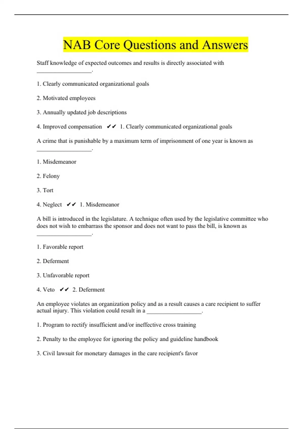 Staff knowledge of expected outcomes and results is directly associated with __________________. 1. Clearly communicated organizational goals 2. Motivated employees 3. Annually updated job descriptions 4. Improved compensation 1. Clearly communicated organizational goals A crime that is punishable by a maximum term of imprisonment of one year is known as __________________. 1. Misdemeanor 2. Felony 3. Tort 4. Neglect 1. Misdemeanor A bill is introduced in the legislature. A technique often used by the legislative committee who does not wish to embarrass the sponsor and does not want to pass the bill, is known as __________________. 1. Favorable report 2. Deferment 3. Unfavorable report 4. Veto 2. Deferment An employee violates an organization policy and as a result causes a care recipient to suffer actual injury. This violation could result in a __________________. 1. Program to rectify insufficient and/or ineffective cross training 2. Penalty to the employee for ignoring the policy and guideline handbook 3. Civil lawsuit for monetary damages in the care recipient's favor 4. Comprehensive paper trail to prove guilt 3. Civil lawsuit for monetary damages in the care recipient's favor Which of the following styles of leadership involves the leader simply stating what needs to be accomplished and how it will be done? 1. Laissez-faire 2. Democratic 3. Autocratic 4. Proactive 1. Laissez-faire Which of the following advance directives is commonly described as appointing someone to make decisions on a care recipient's behalf? 1. Do not resuscitate 2. Living will 3. Durable power of attorney 4. Plan of care 3. Durable power of attorney Team building is a key component of which management style? 1. Participatory 2. Authoritative 3. Delegative 4. Objective 1. Participatory Strategic planning is best defined as an organizational process for __________________. 1. Identifying goals and objectives 2. Implementing goals to create a desired outcome 3. Making decisions that achieve compliance 4. Comparing an organization's market position to its competition 1. Identifying goals and objectives The process of pricing, promoting, and distributing services that satisfy both individual and organizational objectives is known as __________________. 1. Market orientation 2. Marketing 3. Product specialization 4. Branding 2. Marketing Which of the following is not a requirement of the long-term care ombudsman program? 1. Provide public agencies with information regarding problems of care recipients in healthcare organizations 2. Participate and observe the exit conference of a nursing healthcare organization survey 3. License administrators of long-term care to practice the responsibilities of their profession 4. Monitor, develop, and ensure implementation of laws governing long-term care 3. License administrators of long-term care to practice the responsibilities of their profession A document that expresses a care recipient's end-of-life wishes regarding medical treatment is called a/an __________________. 1. Plan of care 2. Advance directive 3. Will and testament 4. Power of attorney 2. Advance directive An arbitration agreement is a __________________. 1. Contract between a lawyer and judge that helps prevent lawsuits 2. Contract between parties agreeing to resolve disputes using a neutral third party 3. More expensive option than going to court to resolve a claim 4. More labor-intensive option than going to court to resolve a claim 2. Contract between parties agreeing to resolve disputes using a neutral third party