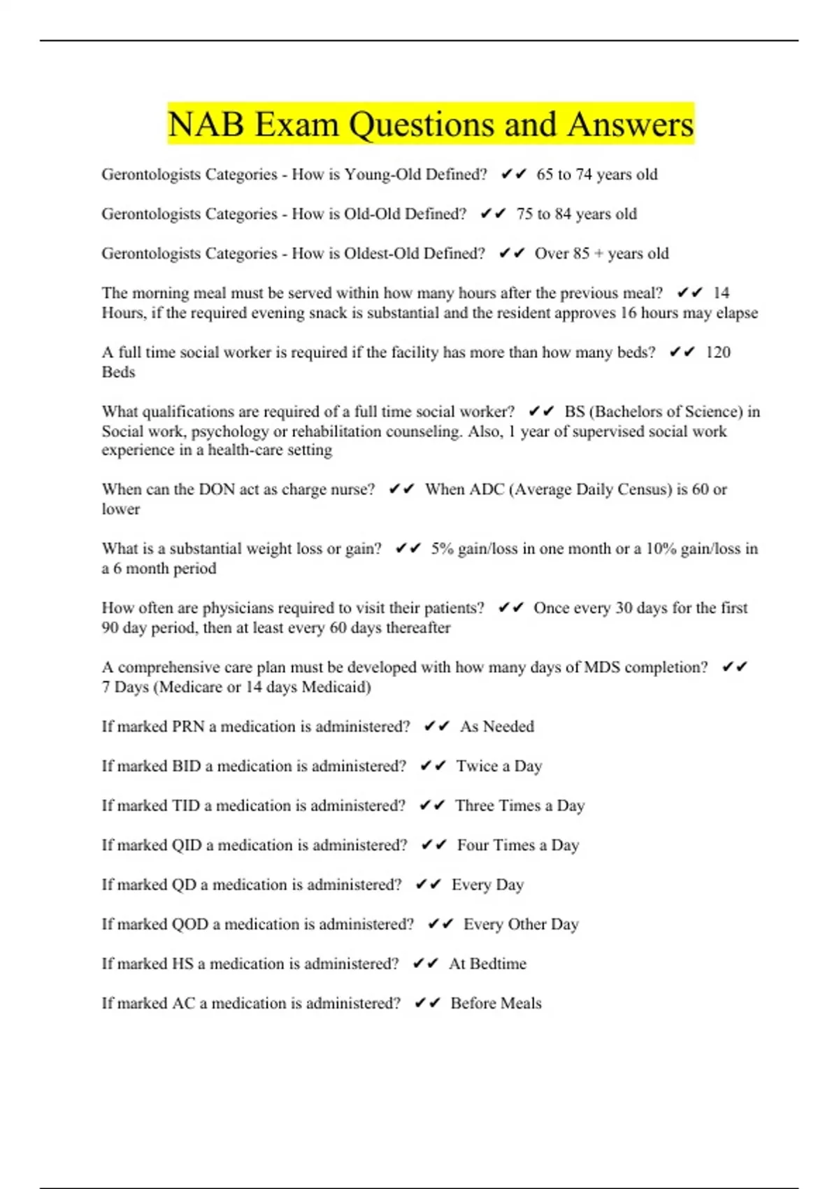 Gerontologists Categories - How is Young-Old Defined? 65 to 74 years old Gerontologists Categories - How is Old-Old Defined? 75 to 84 years old Gerontologists Categories - How is Oldest-Old Defined? Over 85 + years old The morning meal must be served within how many hours after the previous meal? 14 Hours, if the required evening snack is substantial and the resident approves 16 hours may elapse A full time social worker is required if the facility has more than how many beds? 120 Beds What qualifications are required of a full time social worker? BS (Bachelors of Science) in Social work, psychology or rehabilitation counseling. Also, 1 year of supervised social work experience in a health-care setting When can the DON act as charge nurse? When ADC (Average Daily Census) is 60 or lower What is a substantial weight loss or gain? 5% gain/loss in one month or a 10% gain/loss in a 6 month period How often are physicians required to visit their patients? Once every 30 days for the first 90 day period, then at least every 60 days thereafter A comprehensive care plan must be developed with how many days of MDS completion? 7 Days (Medicare or 14 days Medicaid) If marked PRN a medication is administered? As Needed If marked BID a medication is administered? Twice a Day If marked TID a medication is administered? Three Times a Day If marked QID a medication is administered? Four Times a Day If marked QD a medication is administered? Every Day If marked QOD a medication is administered? Every Other Day If marked HS a medication is administered? At Bedtime If marked AC a medication is administered? Before Meals If marked PC a medication is administered? After Meals If marked PO a medication should be given by which route? Orally (by mouth) If marked R a medication should be given by which route? Rectally If marked IV a medication should be given by which route? Intravenously If marked IM a medication should be given by which route? Intramuscularly If marked OD a medication should be given by which route? Right Eye If marked OS a medication should be given by which route? Left Eye If marked OU a medication should be given by which route? Both Eyes If marked AD a medication should be given by which route? Right Ear If marked AS a medication should be given by which route? Left Ear