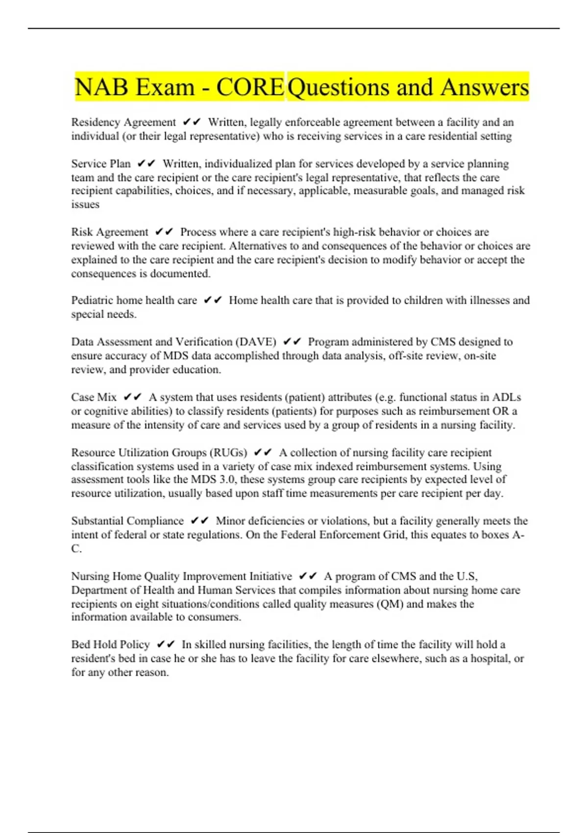 Residency Agreement Written, legally enforceable agreement between a facility and an individual (or their legal representative) who is receiving services in a care residential setting Service Plan Written, individualized plan for services developed by a service planning team and the care recipient or the care recipient's legal representative, that reflects the care recipient capabilities, choices, and if necessary, applicable, measurable goals, and managed risk issues Risk Agreement Process where a care recipient's high-risk behavior or choices are reviewed with the care recipient. Alternatives to and consequences of the behavior or choices are explained to the care recipient and the care recipient's decision to modify behavior or accept the consequences is documented. Pediatric home health care Home health care that is provided to children with illnesses and special needs. Data Assessment and Verification (DAVE) Program administered by CMS designed to ensure accuracy of MDS data accomplished through data analysis, off-site review, on-site review, and provider education. Case Mix A system that uses residents (patient) attributes (e.g. functional status in ADLs or cognitive abilities) to classify residents (patients) for purposes such as reimbursement OR a measure of the intensity of care and services used by a group of residents in a nursing facility.