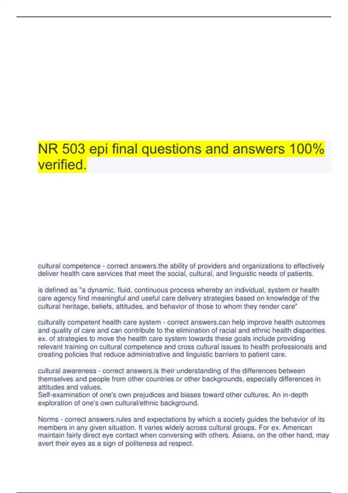 NR 503 epi final questions and answers 100% verified. cultural competence - correct ability of providers and organizations to effectively deliver health care services that meet the social, cultural, and linguistic needs of patients. is defined as "a dynamic, fluid, continuous process whereby an individual, system or health care agency find meaningful and useful care delivery strategies based on knowledge of the cultural heritage, beliefs, attitudes, and behavior of those to whom they render care" culturally competent health care system - correct help improve health outcomes and quality of care and can contribute to the elimination of racial and ethnic health disparities. ex. of strategies to move the health care system towards these goals include providing relevant training on cultural competence and cross cultural issues to health professionals and creating policies that reduce administrative and linguistic barriers to patient care. cultural awareness - correct their understanding of the differences between themselves and people from other countries or other backgrounds, especially differences in attitudes and values. Self-examination of one's own prejudices and biases toward other cultures. An in-depth exploration of one's own cultural/ethnic background. Norms - correct and expectations by which a society guides the behavior of its members in any given situation. It varies widely across cultural groups. For ex. American maintain fairly direct eye contact when conversing with others. Asians, on the other hand, may avert their eyes as a sign of politeness ad respect. values - correct ideas, beliefs, and attitudes about what is important that help guide the way you live. It has major influences on a person's behavior and attitude and serve as broad guidelines in all situations. some common business ____ are fairness, innovation, and community involvement. The Kleinman explanatory model- consists of 3 sectors. - correct popular sector, the professional sector and the folk sector. the model can be used to determine how individuals make decisions. socioeconomic status (SES) - correct an economic and sociological combined total measure of a person's work experience and of an individual's or family's economic and social position in relation to others, based on income, education, and occupation. disparities - correct term is often interpreted to mean racial or ethnic disparities, many dimensions of disparity exist in the U.S, particularly in health. If a health outcome is seen to a greater or lesser extent between populations, there disparity. Race or ethnicity, sex, sexual identity, age, disability, socioeconomic status, and geographic location all contribute to an individual's ability to achieve good health. It is important to recognize the impact that social determinants have on health outcomes of specific populations. healthy people strives to improve the health of all groups. Minorities - correct answers.a culturally, ethnically, or racially distinct group that coexists with but is subordinate to a more dominant group. as the term is used I the social sciences, this subordinacy is the chief defining characteristic of a minority group. As such, minority status does not necessarily correlate population. food desert - correct urban area in which it is difficult to buy affordable or good-quality fresh food. determinant of health - correct range of personal, social, economic, and environmental factors that influence health status determinants of health fall under several broad categories - correct ymaking, social factors, health services, individuals behavior, biology and genetics. It is the interrelationships among these factors that determine individual and population health. Because of this, interventions that target multiple determinants of health are most likely to be effective. Determinants of health reach beyond the boundaries of traditional health care and public health sectors; sectors such as education, housing, transportation, agriculture, and environment can be important allies in improving population health. Social determinants of health - correct answers.• Availability of resources to meet daily needs, such as educational and job opportunities, living wages, or healthful foods • Social norms and attitudes, such as discrimination • Exposure to crime, violence, and social disorder, such as the presence of trash • Social support and social interactions • Exposure to mass media and emerging technologies, such as the Internet or cell phones • Socioeconomic conditions, such as concentrated poverty • Quality schools • Transportation options • Public safety • Residential segregation. They are important because they play a huge part on how a person is treated an how prone they are to have a certain condition. Social justice - correct es that there is a fair and equitable distribution of benefits and burdens in a society Data Sources used to assess determinants of health include: - correct answers.Chronic Disease Indicators, Interactive Atlas of Heart Disease and Stroke, National Center for HIV/AIDS, Viral Hepatitis, STD, and TB Prevention Atlas, National Environmental Public Health Tracking Network, and The Social Vulnerability Index. Genetic testing - correct zes your DNA to detect specific, inheritable, disease-related gene mutations that may increase the risk of certain cancers. It provides you with an in-depth cancer risk assessment. Genomics - correct an interdisciplinary field of biology focusing on the structure, function, evolution, mapping, and editing of genomes. A genome is an organism's complete set of DNA, including all of its genes. Pharmacogenomics - correct the study of how genes affect a person's response to drugs. This relatively new field combines pharmacology (the science of drugs) and genomics (the study of genes and their functions) to develop effective, safe medications and doses that will be tailored to a person's genetic makeup Genetic epidemiol