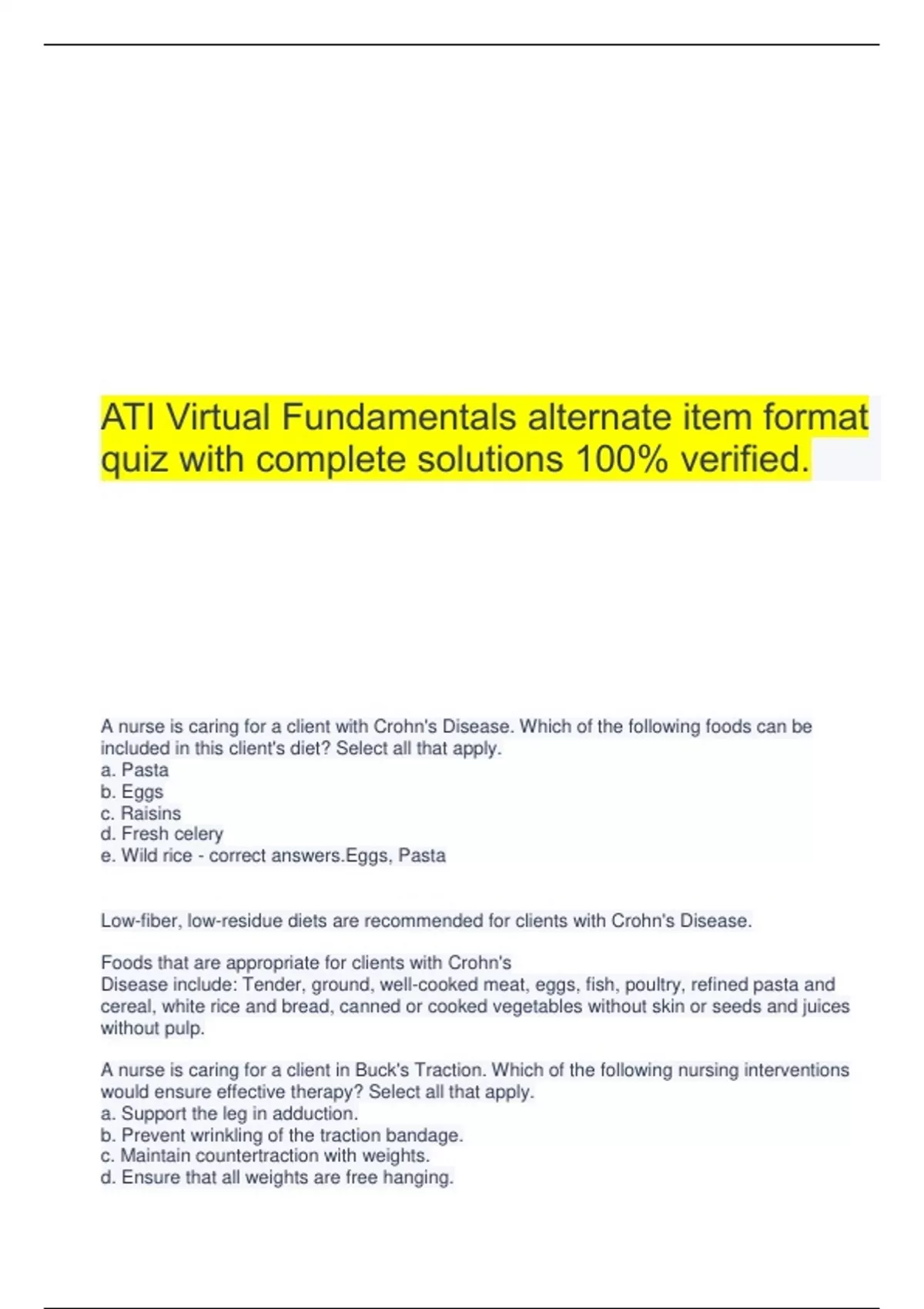ATI Virtual Fundamentals alternate item format quiz with complete solutions 100% verified. A nurse is caring for a client with Crohn's Disease. Which of the following foods can be included in this client's diet? Select all that apply. a. Pasta b. Eggs c. Raisins d. Fresh celery e. Wild rice - correct answers.Eggs, Pasta Low-fiber, low-residue diets are recommended for clients with Crohn's Disease. Foods that are appropriate for clients with Crohn's Disease include: Tender, ground, well-cooked meat, eggs, fish, poultry, refined pasta and cereal, white rice and bread, canned or cooked vegetables without skin or seeds and juices without pulp. A nurse is caring for a client in Buck's Traction. Which of the following nursing interventions would ensure effective therapy? Select all that apply. a. Support the leg in adduction. b. Prevent wrinkling of the traction bandage. c. Maintain countertraction with weights. d. Ensure that all weights are free hanging. e. Assist the client to roll from side to side. - correct answers.Ensure that all weights are free hanging., Prevent wrinkling of the traction bandage. A nurse is caring for a client who is one month post bariatric surgery and has been diagnosed with dumping syndrome. Which of the following recommendations is appropriate? Select all that apply. a. Sit up for at least an hour after each meal. b. Reduce the amount of protein and fat in the diet. c. Eliminate liquids with meals, and for one hour before and after meals. d. Avoid consuming milk, sweets, and sugars. e. Eat small, frequent meals during the day. - correct answers.Avoid consuming milk, sweets, and sugars., Eat small, frequent meals during the day., Eliminate liquids with meals, and for one hour before and after meals. Dumping syndrome frequently occurs after bariatric surgery and symptoms can include vertigo, syncope, pallor, diaphoresis, tachycardia, and palpitations. Therapy includes: small, frequent meals rather than large ones; avoidance of milk, sweets, and sugars; elimination of liquids with meals and for one hour before and after meals; reduction in the amount of fluid ingested at one time, eating a high-protein, high-fat, and low-to- moderate carbohydrate diet; and lying down after meals to slow transit time of food in the intestines. A nurse is caring for a client hospitalized with Guillain-Barré Syndrome who has been in the intensive care unit on a ventilator for four days. Which of the following would be most appropriate in assessing for complications of immobility? Select all that apply. a. Assess the character of bowel sounds and frequency of stools. b. Observe skin color over sacral, heels, and scapulae areas. c. Assess rate and depth of respiratory effort. d. Assessing the client's ability to move lower extremities. e. Performing range of motion on the client's ankles, knees, and hips. - correct answers.The correct answer is: Performing range of motion on the client's ankles, knees, and hips., Assess the character of bowel sounds and frequency of stools., Observe skin color over sacral, heels, and scapulae areas. Potential complications of immobility could include the following: loss of joint motion and contractures, decreased gastrointestinal motility and constipation, deep vein thrombosis with erythema and swelling of the calf areas, and skin breakdown with early evidence of pallor, erythema, blistering over bony prominences. An 87-year-old client has been admitted repeatedly to the acute care setting for pneumonia. The client's family asks what measures can help prevent recurrent respiratory issues. Which of the following measures should the nurse discuss to prevent respiratory issues? Select all that apply. a. Use a humidifier to moisten the air in the client's room, when needed. b. Administer a prior dosage of antibiotics when the client has a cough. c. Ambulate the client regularly, daily. d. Encourage a diet high in protein. e. Reassure the client during respiratory distress. - correct answers.Ambulate the client regularly, daily., Use a humidifier to moisten the air in the client's room, when needed., Reassure the client during respiratory distress. Encourage structured activities, after learning the client's physical capabilities and provide rest periods to prevent dyspnea. Using a humidifier during drier seasons can help prevent secretions from becoming thick and difficult to expectorate. If a client is having difficulty breathing, the caregiver(s) should provide support and reassurance to decrease the client's anxiety. A nurse is assisting a client with an advance directive. Which of the following nursing responsibilities should be included regarding advance directives? Select all that apply. a. Inform all members of the client's family of the client's wishes. b. Ensure that each family member receives a copy of the advance directive. c. Provide written information to the client about advance directives. d. Document the client's advance directive in the medical chart. e. Confirm that the advance directive is current. - correct answers.: Confirm that the advance directive is current., Document the client's advance directive in the medical chart., Provide written information to the client about advance directives. The nursing responsibility regarding advance directives is to ensure that the advance directive is current and reflective of the client's current decisions. Which of the following client care assignments is appropriate for the nurse to delegate to unlicensed assistive personnel (UAP)? Select all that apply. a. Assist a client with a new transurethral prostectomy with perineal care. b. Transport a client who is utilizing oxygen and has a peripheral IV catheter. c. Obtain vital signs every 4 hours for a client with ulcerative colitis. d. Provide initial food by mouth for a client who has experienced a brain attack. e. Apply a dressing to a superficial laceration on the client's arm. - correct answers.Obtain vital signs every 4 hours for a client with 