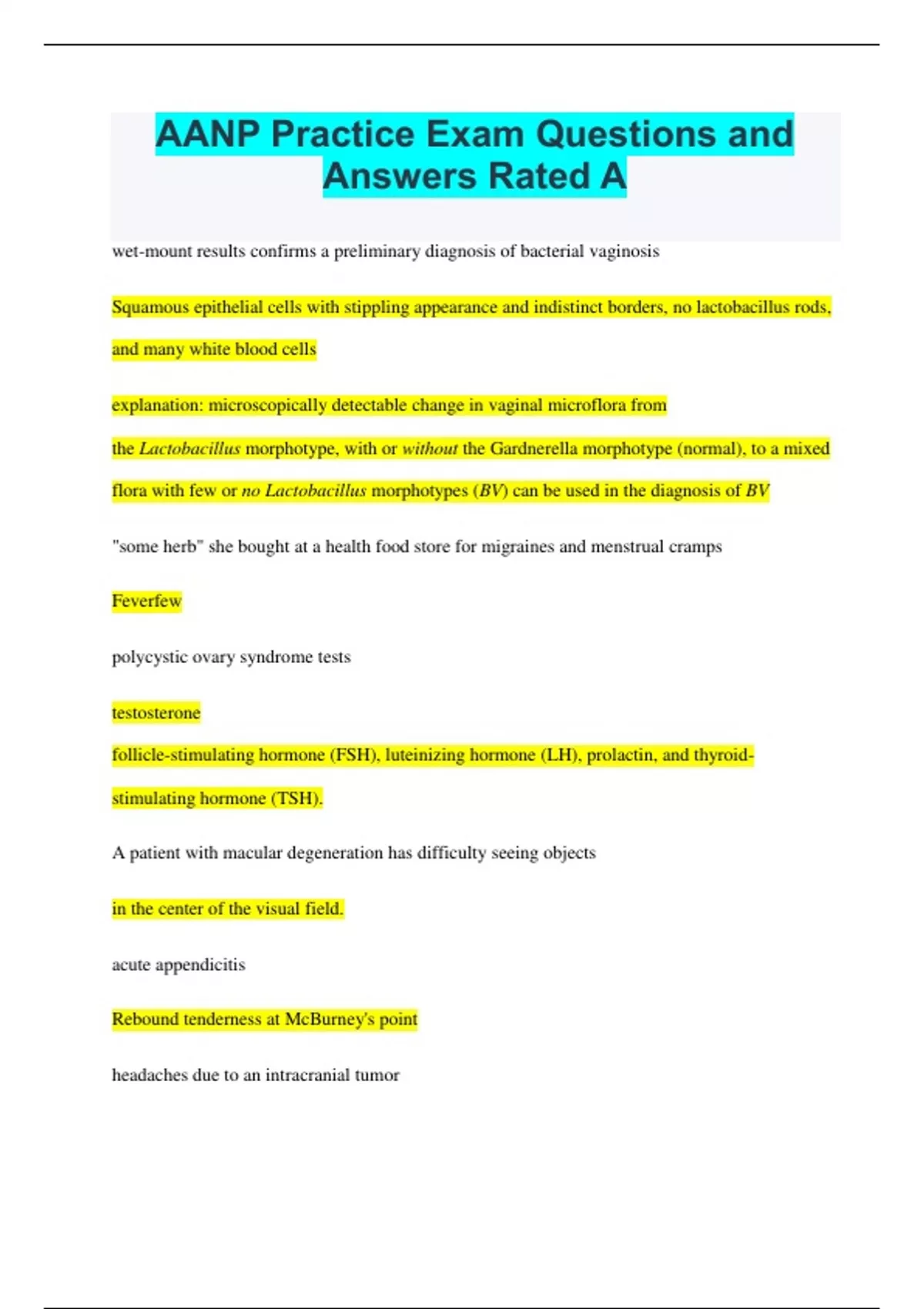 wet-mount results confirms a preliminary diagnosis of bacterial vaginosis Squamous epithelial cells with stippling appearance and indistinct borders, no lactobacillus rods, and many white blood cells explanation: microscopically detectable change in vaginal microflora from the Lactobacillus morphotype, with or without the Gardnerella morphotype (normal), to a mixed flora with few or no Lactobacillus morphotypes (BV) can be used in the diagnosis of BV "some herb" she bought at a health food store for migraines and menstrual cramps Feverfew polycystic ovary syndrome tests testosterone follicle-stimulating hormone (FSH), luteinizing hormone (LH), prolactin, and thyroid- stimulating hormone (TSH). A patient with macular degeneration has difficulty seeing objects in the center of the visual field. acute appendicitis Rebound tenderness at McBurney's point headaches due to an intracranial tumor