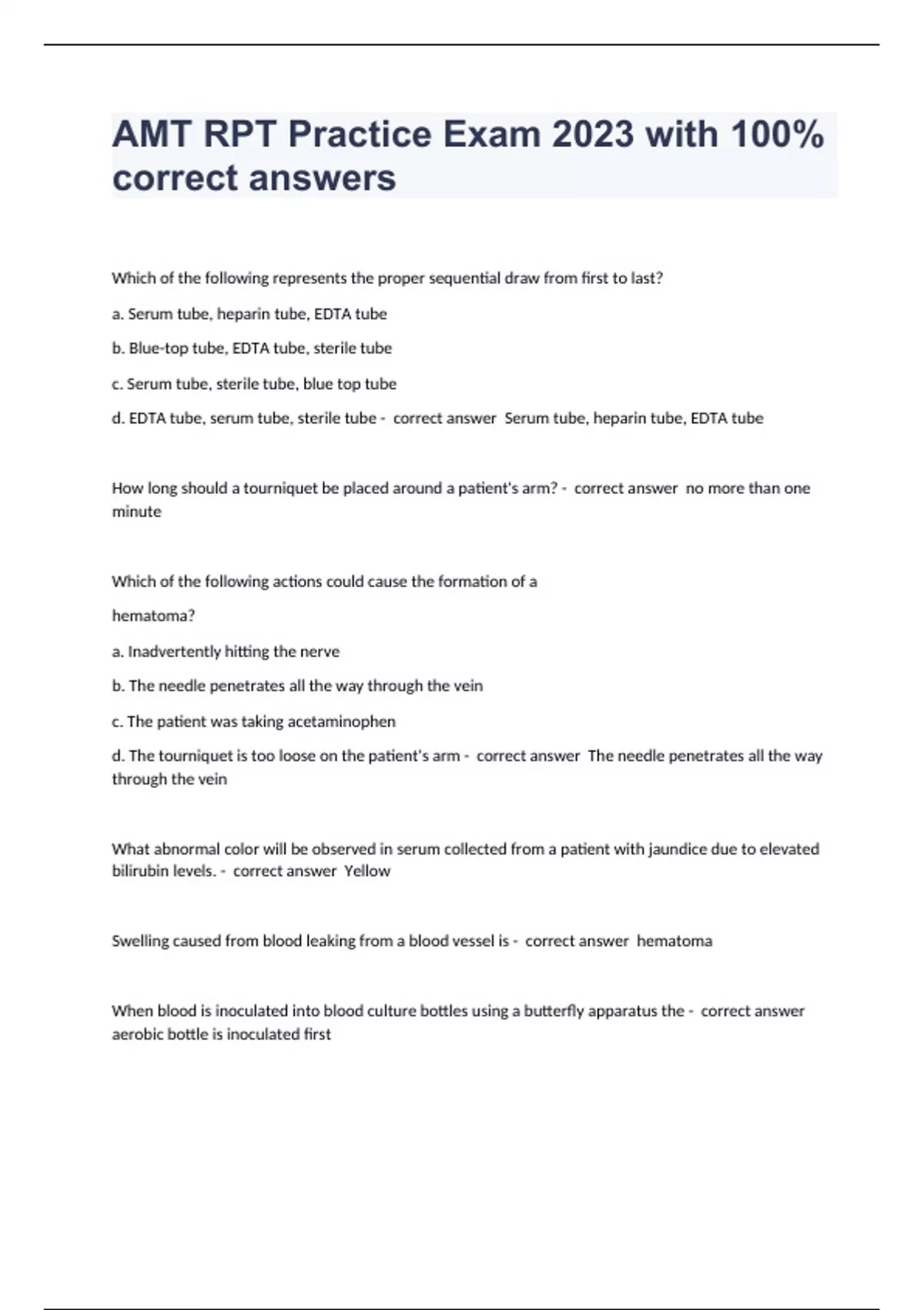 Which of the following represents the proper sequential draw from first to last? a. Serum tube, heparin tube, EDTA tube b. Blue-top tube, EDTA tube, sterile tube c. Serum tube, sterile tube, blue top tube d. EDTA tube, serum tube, sterile tube - correct answer Serum tube, heparin tube, EDTA tube How long should a tourniquet be placed around a patient's arm? - correct answer no more than one minute Which of the following actions could cause the formation of a hematoma? a. Inadvertently hitting the nerve b. The needle penetrates all the way through the vein c. The patient was taking acetaminophen d. The tourniquet is too loose on the patient's arm - correct answer The needle penetrates all the way through the vein What abnormal color will be observed in serum collected from a patient with jaundice due to elevated bilirubin levels. - correct answer Yellow Swelling caused from blood leaking from a blood vessel is - correct answer hematoma When blood is inoculated into blood culture bottles using a butterfly apparatus the - correct answer aerobic bottle is inoculated first